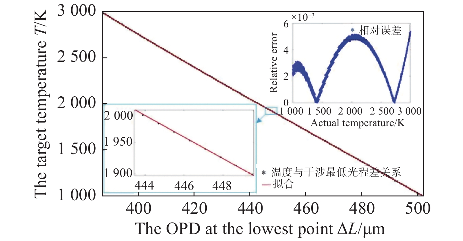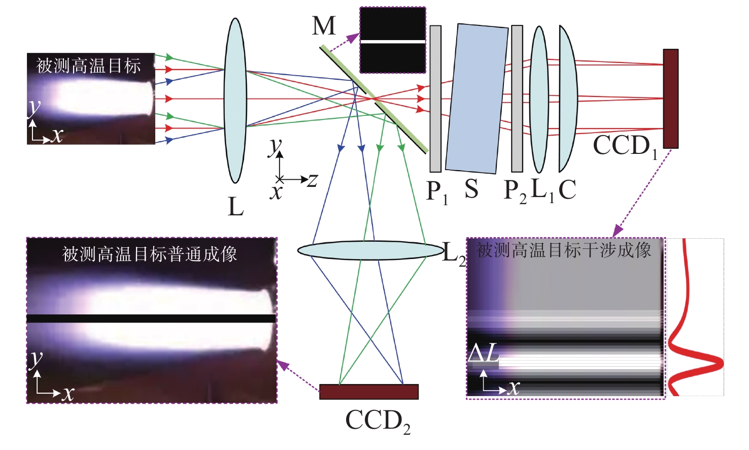 为了实现航空航天发动机尾焰、燃烧、爆炸等高温温度场的非接触高精度测量,对静态干涉型高温温度场探测方法展开研究。首先,设计静态干涉型高温温度场探测系统,理论分析高温温度场测量原理,研究高温干涉信号强度最低点光程差与温度的关系;其次,针对常用温度范围及可见光面阵探测器的响应波段,设计静态干涉具Savart棱镜,结合一维扫描实现温度场成像;最后,设计光学系统,拟合获得干涉最弱光程差与温度的对应关系,并获得线性拟合公式,仿真验证温度场经过系统后到达面阵探测器的干涉信号图像。结果表明,该静态干涉型高温温度场探测方法可实现1000 K−3000 K温度的高精度探测,且在线性区域,温度测量分辨率为1.4 K,温度测量相对误差优于0.8%。本文研究为军民领域的高精度高温温度场成像提供参考。