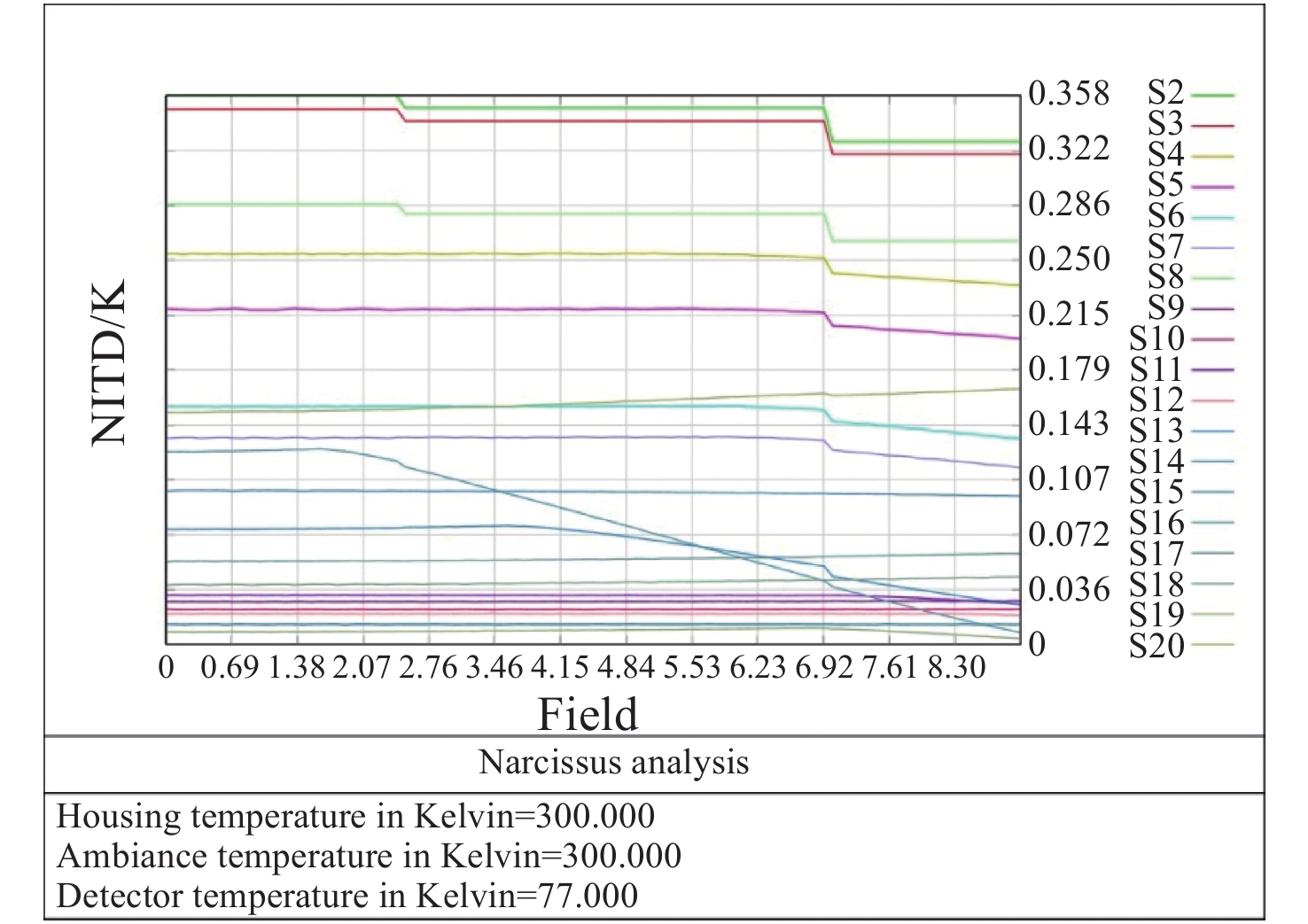 在大温差条件下,由于温度剧烈变化导致红外光学系统成像质量变差。用于机载林火监测的大视场中波红外相机工作环境变化剧烈,对杂散辐射要求较高。为保证光学系统在要求的大视场和大温差条件下具有稳定的性能和良好的成像质量,通过基于消热差的设计方法和基于噪声等效温差的杂散辐射综合评价方法,设计了一套制冷型中波红外光学系统。该光学系统由6片透镜和1片滤光片组成,工作波段为3.7~4.8 μm,F数为2.5,焦距为62.5 mm,视场为14.36°×10.87°,探测器采用640×512 阵列中波制冷型探测器,通过采用硅、锗材料组合,合理分配光焦度,实现了消色差和消热差设计,通过冷反射优化和冷光阑匹配设计,较好地抑制了系统的杂散辐射噪声,通过引入少量非球面优化,在满足指标要求的情况下,对高阶像差进行了校正。结果表明,光学系统在−55~+70 °C温度范围内,成像质量稳定良好。