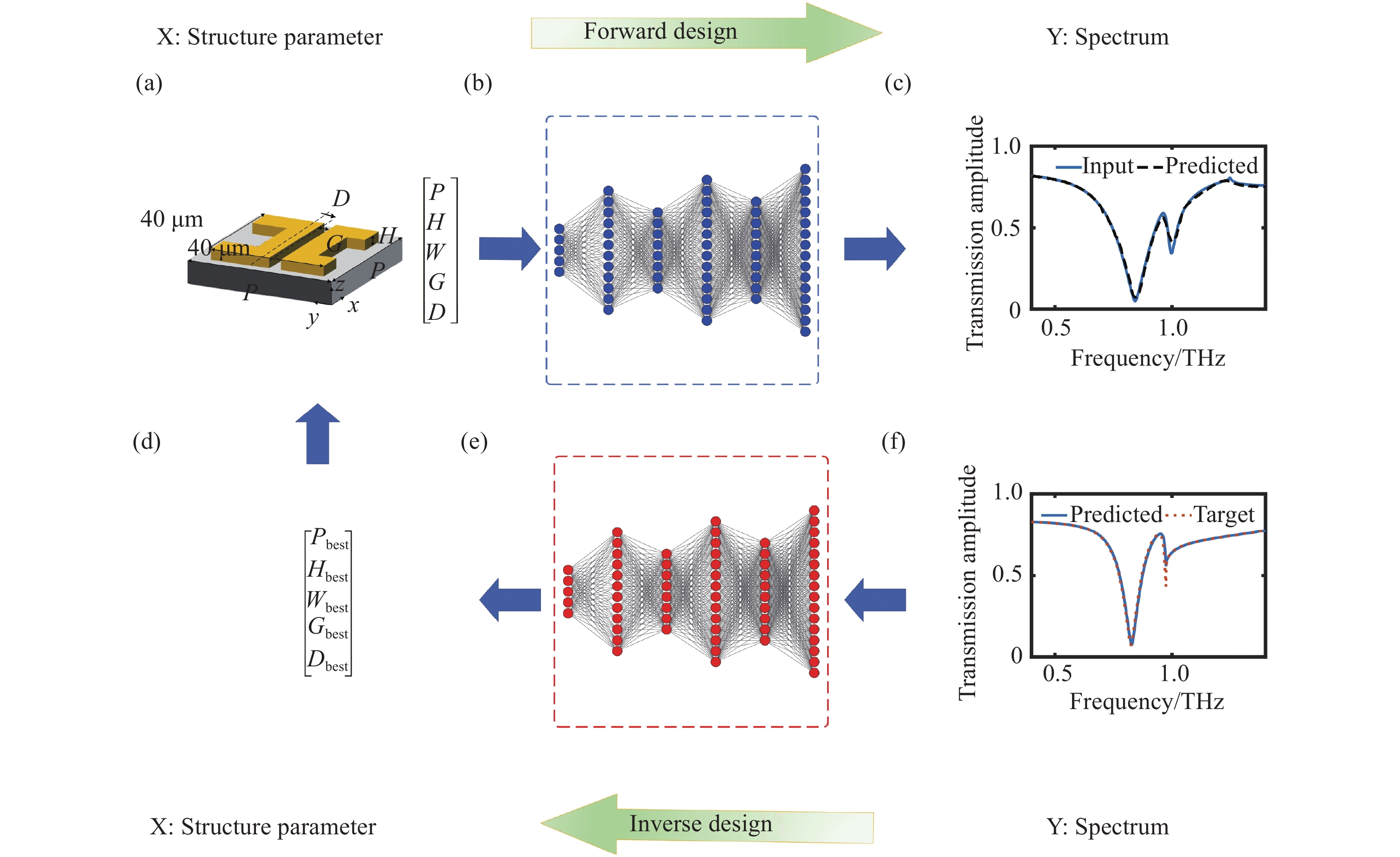 本文提出了一种基于深度学习的超材料Fano共振设计方法,能够获得高Q共振的线宽、振幅和光谱位置特性。利用深度神经网络建立结构参数和透射谱曲线之间的映射,正向网络实现对透射谱的预测,逆向网络实现对高Q共振按需设计,设计过程中实现了低均方误差(MSE),训练集的均方误差为 0.007。与传统方法需要耗时的逐个数值模拟相比,深度学习设计方法大大简化了设计过程,实现了高效、快速的设计目标。对Fano共振的设计也可推广应用到其它类型的超材料的自动逆向设计,显著提高了更复杂的超材料设计的可行性。
