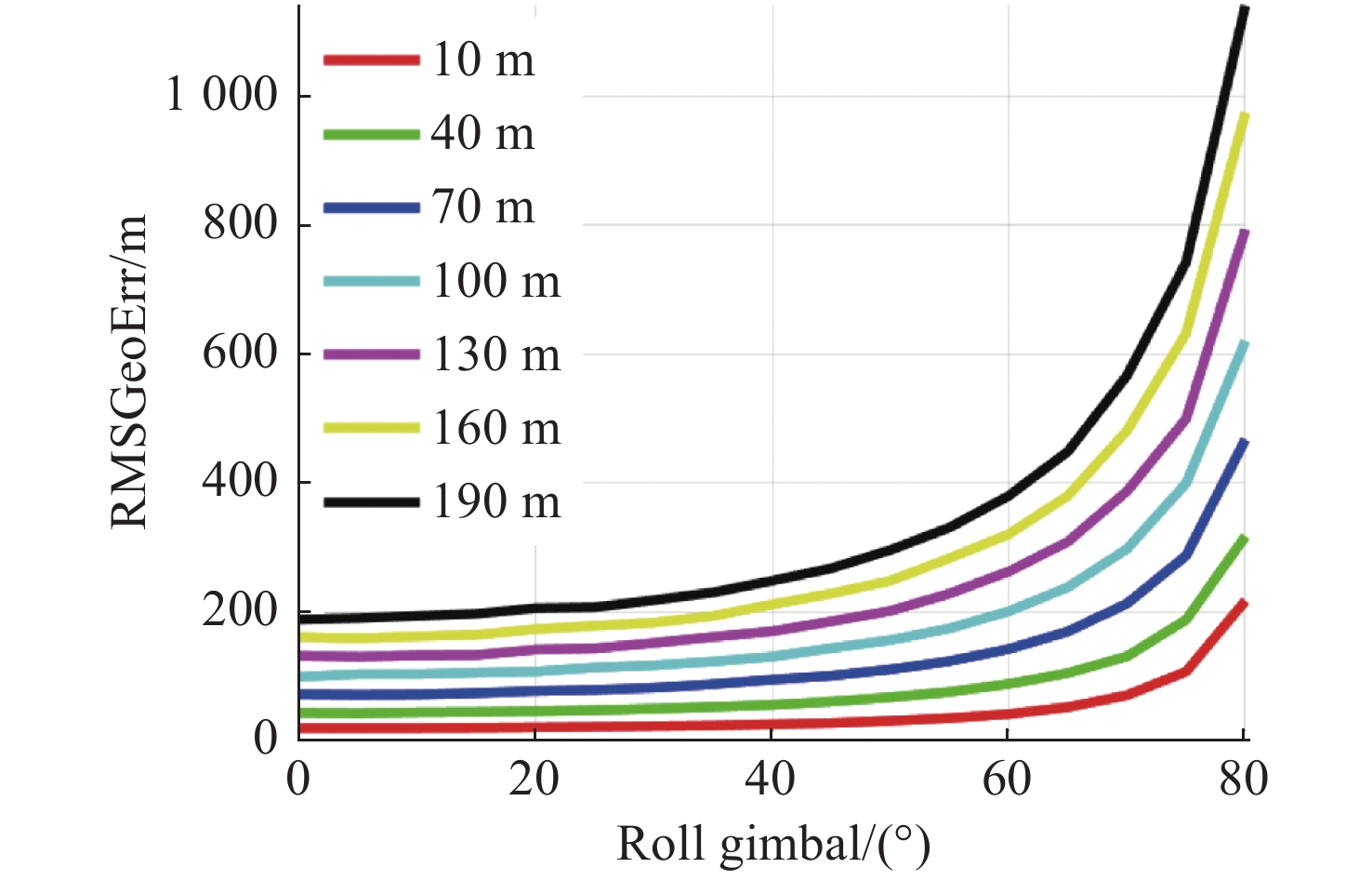 在大倾角航空相机对地面目标定位过程中,借助数字高程模型(DEM)可有效解决地球椭球模型定位存在的大地高误差影响。为获取地面坐标的准确信息特别是高程信息,首先,根据载机的位置姿态信息以及航空相机的框架角等信息利用齐次坐标变换求解出成像系统视轴在地理坐标系下的指向,再利用数字高程模型确定目标点的坐标。针对成像过程中目标点高程计算繁琐、容易不迭代等问题,提出了一种对目标高程值进行快速迭代的方法。通过对目标区域高程进行折半查找处理,计算该处视轴光线高程与地面高程差值。继续计算该高程差中值并继续迭代,直到小于一定阈值。最后使用蒙特卡洛分析法对整个成像过程存在的误差项进行分析。实验结果表明:采用快速迭代法进行计算,当收敛阈值为十分之一DEM网格精度时,迭代效率提升45.5%,收敛速度大大提高;且通过数字高程模型计算,在飞行高度为15409 m,相机框架角大于74°时,对于山地区域目标的圆概率误差小于200 m,可以满足实际工程需要。