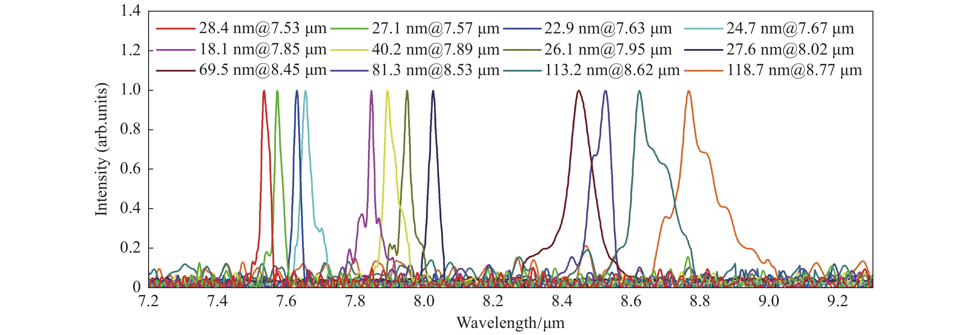 为了获得可调谐长波红外激光输出,本文设计了一种基于ZnGeP2(ZGP)温度调谐的长波红外光参量振荡器。采用中心波长为2097 nm的Ho:YAG激光器泵浦不同相位匹配角的ZGP晶体,通过改变晶体工作温度来研究ZnGeP2光参量振荡器(ZGP-OPO)的温度调谐特性。在15~30 °C温度范围内,实现了7.53~8.77 μm分段可调谐长波激光输出,总调谐宽度为1.24 μm。整个调谐范围内,输出功率大于1.503 W,当闲频光波长为8.77 μm时,输出功率为1.503 W,斜率效率和光光转换效率分别为12.19%和6.53%。实验结果表明,ZGP温度调谐是实现连续可调谐长波红外激光输出的有效技术途径。本实验研究在可调谐长波固体激光器工程化领域具有潜在的应用价值。