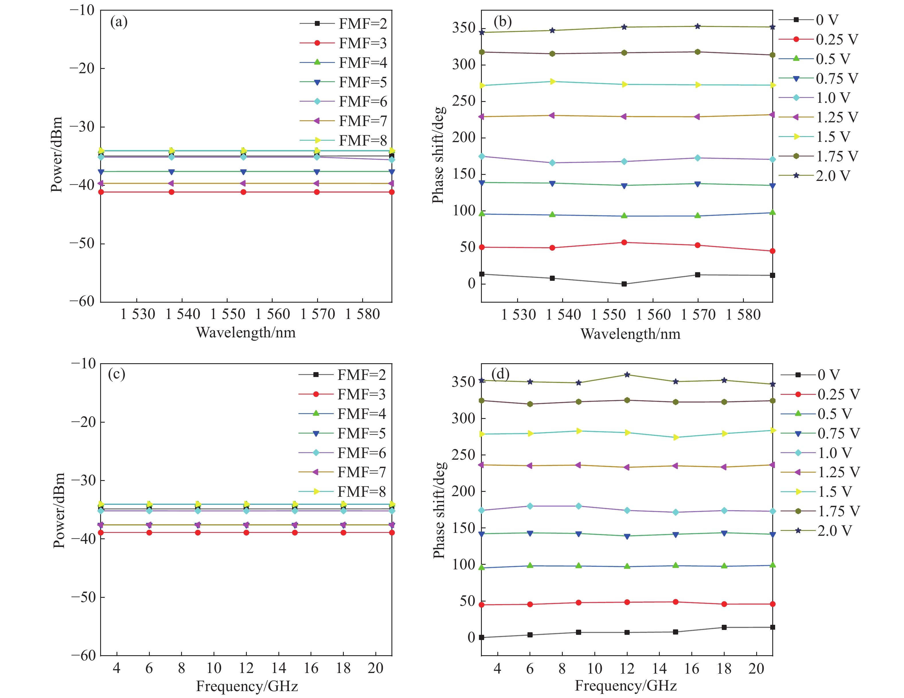 提出一种倍频因子连续可调,且相位连续变化的微波光子移相系统。该方案使用两个并联的马赫曾德尔调制器,通过2×2光耦器与两个双并联的集成马赫曾德尔调制器级联,产生可调节的±1~4阶边带,并使用相位调制器对其中一个光波进行相移。通过调整DPMZM的射频驱动信号和直流偏置电压以及PM的直流电压,可以产生相位从0到360°连续可调的2到8次谐波。仿真结果表明,当射频信号频率为10 GHz时,可产生频率为20~80 GHz的微波信号。当相位调制器的直流偏置电压与半波电压比值在0到2间变化时,对应微波信号的相位从0°到360°变化,可以获得约20 dB的大光边带抑制比(OSSR)和电杂散抑制比(ESSR)。此外,分析了调制器消光比对输出微波信号光载波抑制比和电杂散抑制比的影响,以及光载波的波长和功率对微波信号幅度波动的影响。
