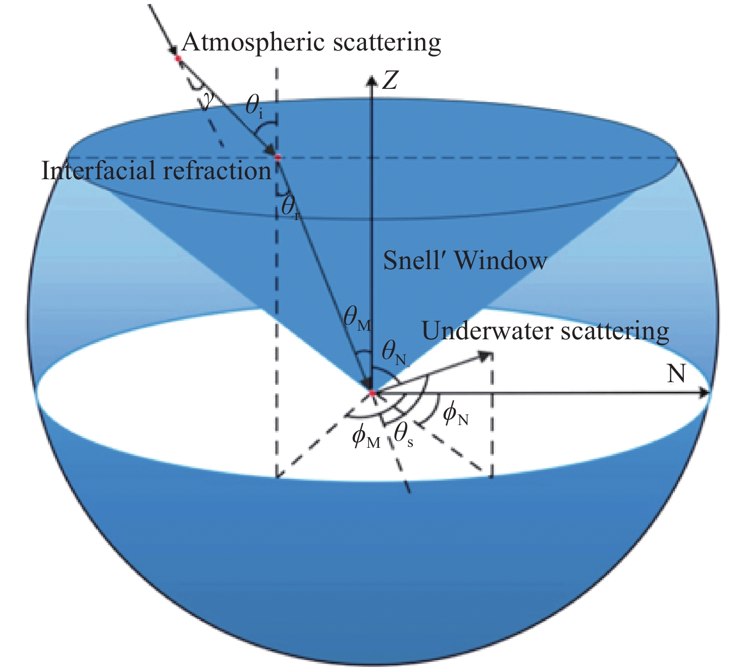 太阳光经大气散射与水面折射后会形成有一定分布特性的水下偏振光,利用水下偏振光的偏振分布模式可实现水下导航。本文提出了基于波浪水面下偏振光分布模式的气-水模型,可用于计算大气多次散射后波浪折射影响下水下偏振光的偏振分布模式。模拟并对比分析了平静水面、正弦波浪与随机波浪下,不同太阳高度角的水下偏振光的偏振度和偏振角的分布图像,并通过水下实验进行了验证。水下偏振光模式模拟结果与实测结果的对比表明,利用该模型可以准确表征典型波浪水面下的偏振光分布模式特性,为提高水下偏振导航在水面波动条件下的环境适应性提供理论模型基础。
