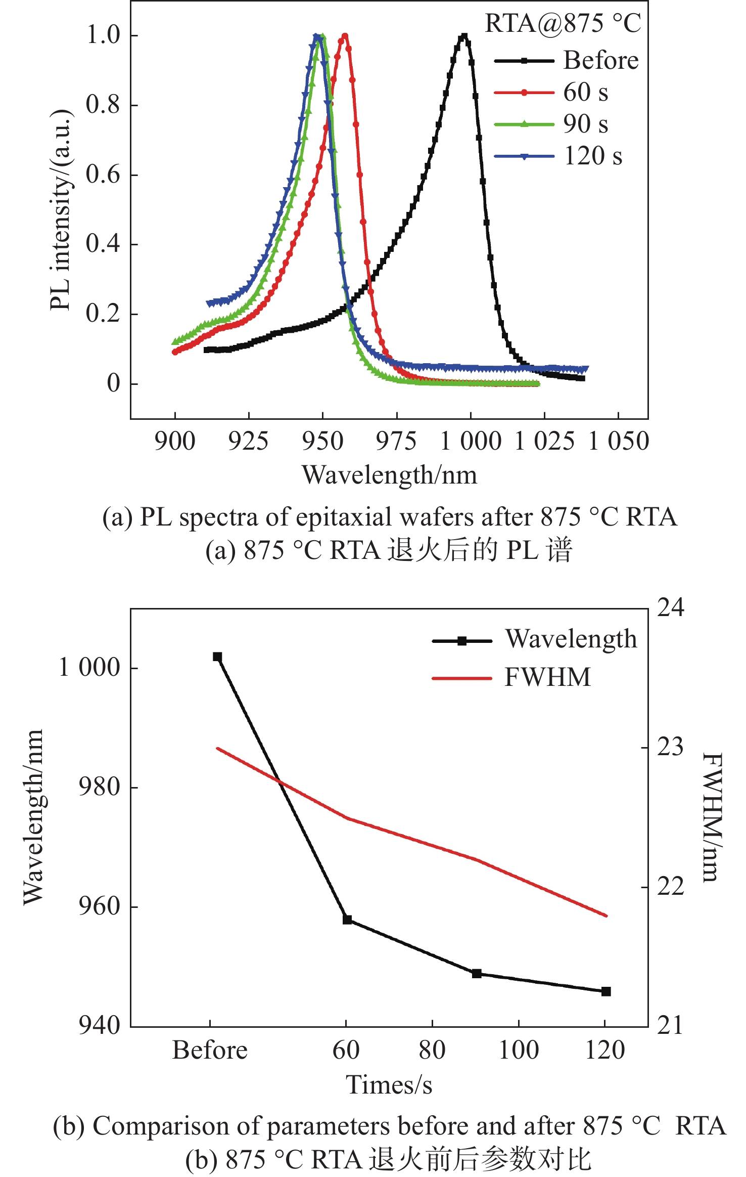 腔面光学灾变损伤是导致高功率量子阱半导体激光器阈值输出功率受限制的关键因素。通过量子阱混杂技术调整半导体激光器腔面局部区域处有源区材料的带隙宽度,形成对输出光透明的非吸收窗口,可提高激光器输出功率。本文基于InGaAs/AlGaAs高功率量子阱半导体激光器初级外延片,以外延Si单晶层作为扩散源,结合快速热退火方法开展了杂质诱导量子阱混杂研究。探索了介质层生长温度、介质层厚度、热处理温度、热处理时间等条件对混杂效果的影响。结果表明,50 nm的650 °C低温外延Si介质层并结合875 °C/90 s快速热退火处理可在保证光致发光谱的同时获得约57 nm的波长蓝移量。能谱测试发现,Si杂质扩散到初级外延片上的波导层是导致量子阱混杂效果显著的关键。