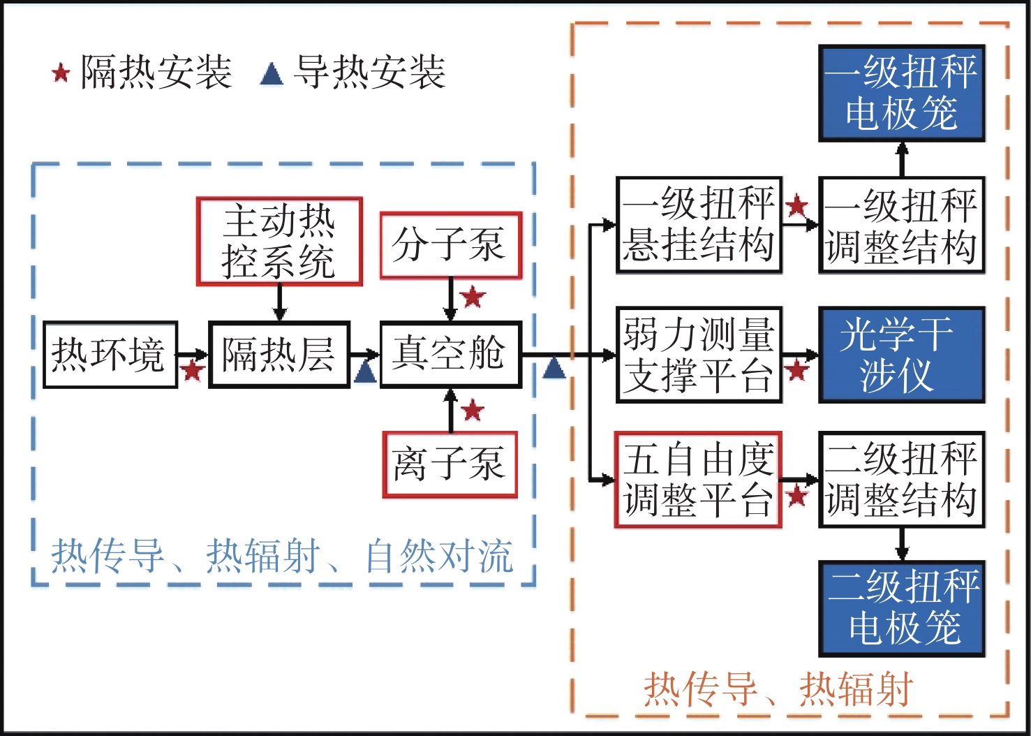 为了满足惯性传感器地面弱力测量系统的超高温度稳定性要求,对整个系统进行了热设计。首先,介绍了惯性传感器地面弱力测量系统的结构、敏感结构传热路径和内部热源。其次,根据系统热控指标要求,提出了采用三级热控结构和比例积分微分(PID)控制算法相结合的高精度热控方式,减少温度噪声对惯性传感器探测灵敏度的影响。然后,采用UG/NX软件建立有限元模型,并进行了不同工况条件下的热分析计算,得到了惯性传感器地面弱力测量系统在时域上达到平衡后的温度变化值为(1.2~1.6) ×10−5 K。最后,将惯性传感器地面弱力测量系统在时域上的温度分布在频域上进行描述,得到惯性传感器敏感结构的温度稳定性结果。分析结果表明,在当前热控措施下,惯性传感器敏感结构的温度稳定性均优于10−4 K/Hz1/2,满足热控指标需求,热设计方案合理可行。