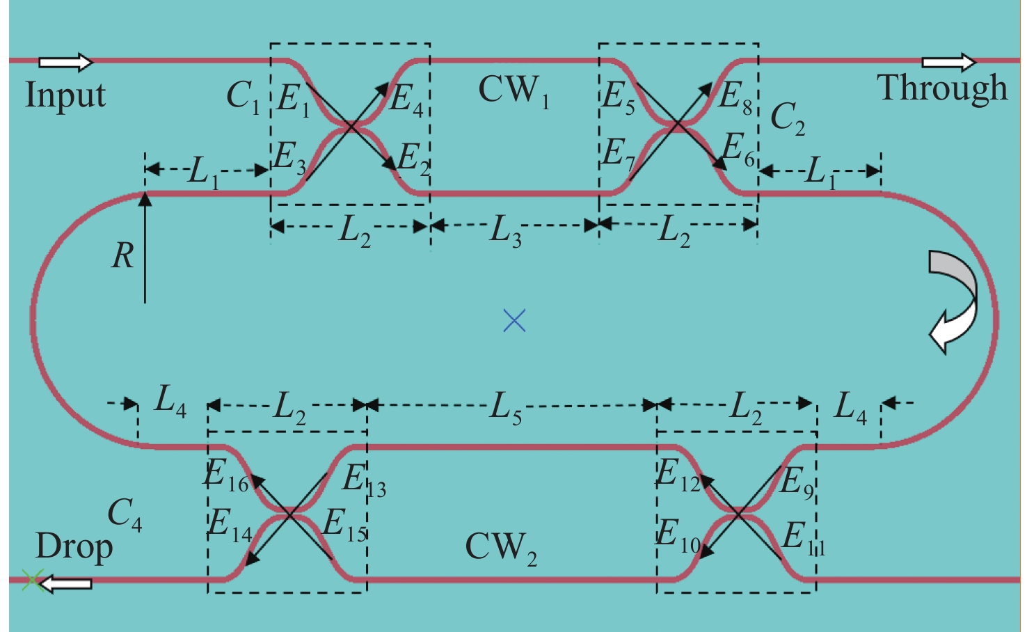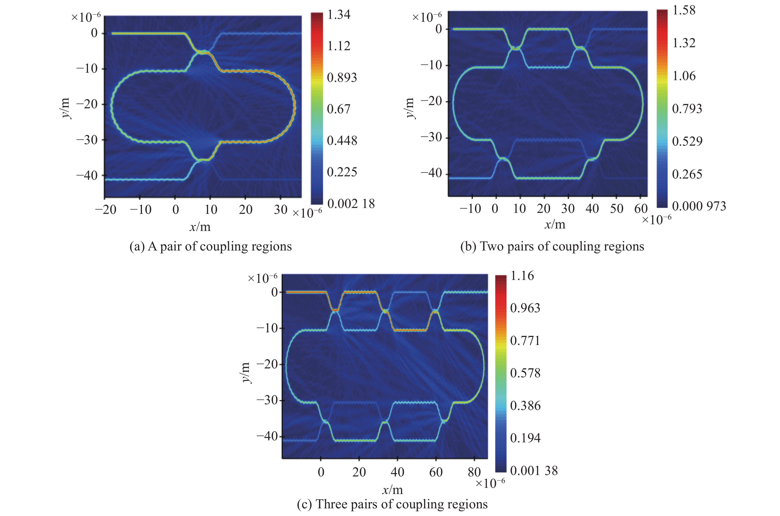 为了探究鼎形微环谐振器的耦合区数量对输出的影响,建立了鼎形微环谐振器的物理模型。利用传输矩阵法对鼎形微环谐振器的物理模型进行研究。分析了不同耦合区数量对鼎形微环谐振器输出的影响。实验结果表明,随着耦合区数量的增加,在1.54~1.56 μm工作波长范围内谐振峰的数量增加,半高全宽FWHM越小,品质因子Q则越大,器件的储能性能越好,并且还能实现对特定波长的滤波作用。耦合区数量对鼎形微环谐振器性能有着很大影响,在设计时根据实际需要选择耦合区数量。