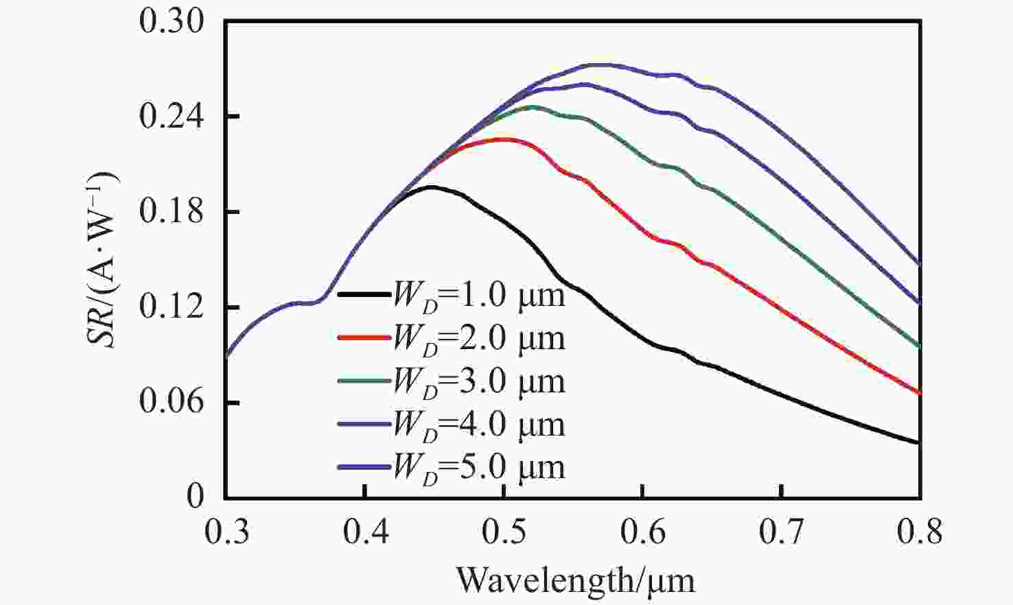摘要: 为了实现硅基雪崩光电二极管蓝光波段(400~500 nm)高光响应度,设计了SACM型基本器件结构,探究了倍增层厚度对器件的雪崩击穿电压及光电流增益的影响及倍增层掺杂浓度对光响应度的影响,综合考虑光响应度和击穿电压的因素,结果表明:当表面非耗尽层掺杂浓度为1.0×1018 cm−3、厚度为0.03 μm;吸收层掺杂浓度为1.0×1015 cm−3、厚度为1.3 μm;场控层掺杂浓度为8.0×1016 cm−3、厚度为0.2 μm;倍增层掺杂浓度为1.8×1016 cm−3、厚度为0.5 μm时,器件具有较低的击穿电压Vbr-apd=34.2 V。当Vapd=0.95 Vbr-apd,该结构在蓝光波段具较高的光响应度(SR=3.72~6.08 A·W−1)。上述研究结果对高蓝光探测响应度Si-APD实际器件的制备具有一定的参考价值。Abstract: In order to achieve high spectral responsivity of the silicon avalanche photodiode in blue band (400−500 nm), Separated Absorption Control Multiplication (SACM) basic device structure was designed. Based on multiple physical models, the effect of the thickness on the avalanche breakdown voltage and the photocurrent gain of the device and the effect of the doping concentration of the multiplication layer on the optical responsivity were investigated. Comprehensively considering the factors of light responsivity and breakdown voltage, the results show that the device has a low breakdown voltage Vbr-apd=34.2 V when the doping concentration of the surface non-depleted layer is 1.0×1018 cm−3, and the thickness is 0.03 μm; the doping concentration of absorption layer is 1.0×1015 cm−3, the thickness is 1.3 μm, the doping concentration of field control layer is 8.0×1016 cm−3, the thickness is 0.2 μm and the doping concentration of double layer is 1.8×1016 cm−3 and the thickness is 0.5 μm. When Vapd=0.95Vbr-apd, it has higher optical responsivity in blue band, i.e. SR is 3.72~6.08 A·W−1. The above research results provide certain theoretical reference for the preparation of practical Si-APD devices with high blue light detection responsivity.