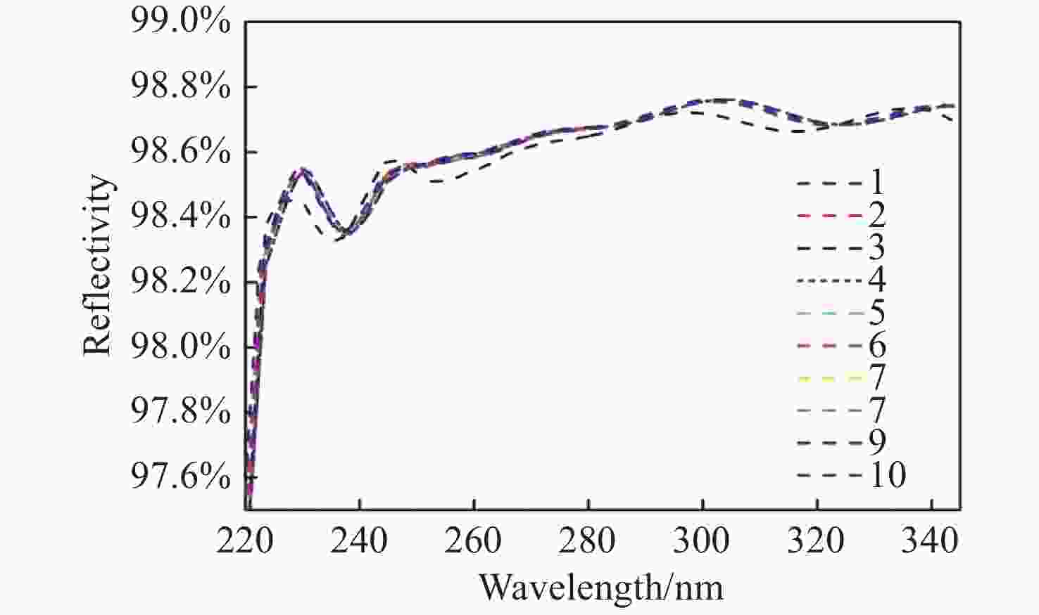 Parameters Indicators Substrate JGS1 Angle of incidence /(°) 0 Spectral range /nm 230~300 Reflectance ≥97.5% Heterogeneity ≤0.5% 表 3 薄膜制备工艺参数
