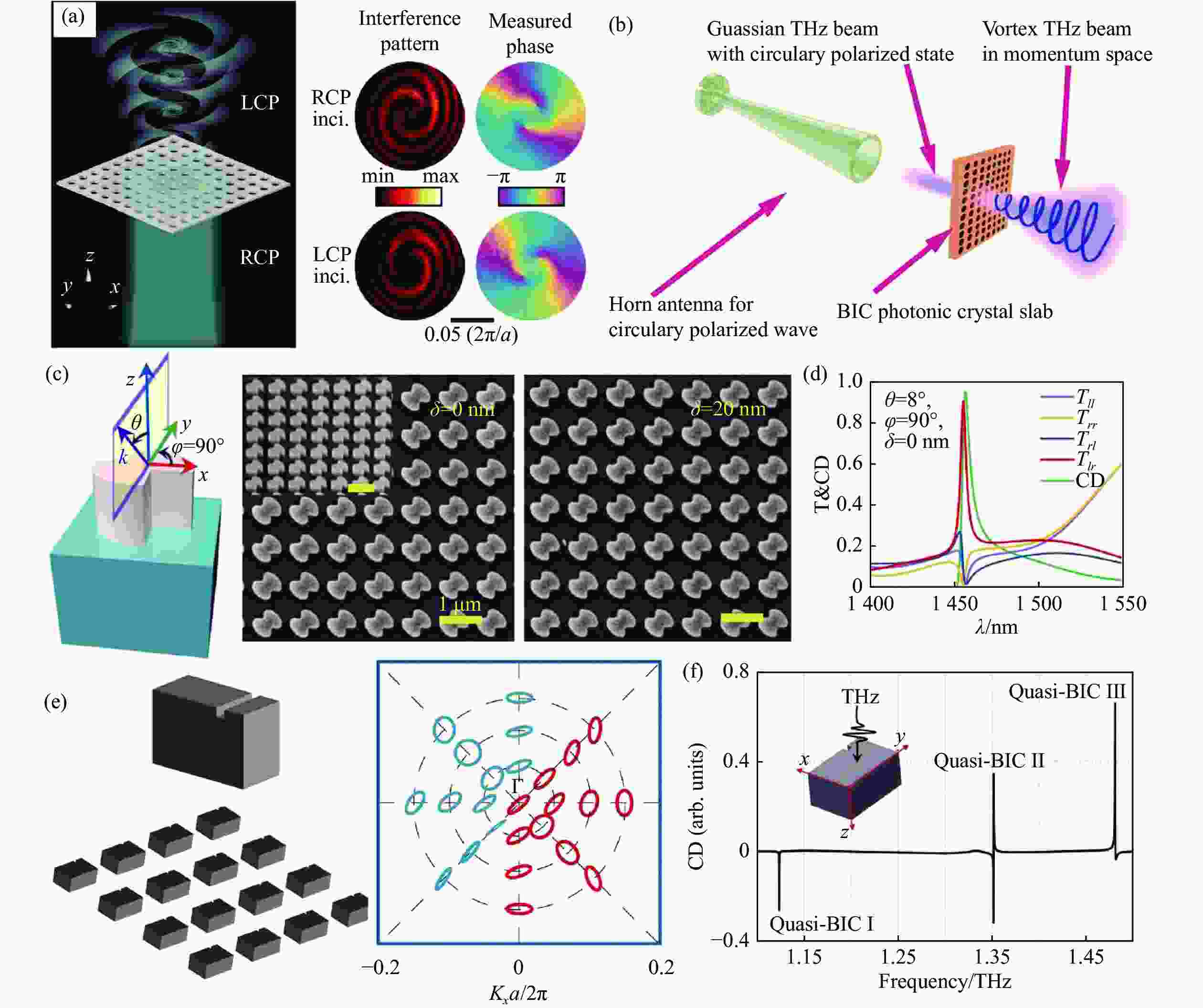 图 11 (a)基于BIC光子晶体板的动量空间涡旋束产生示意图,动量空间辐射偏振分布(左)和圆偏振入射时测试的电场相位和强度分布(右)[136];(b)本课题组提出的将BIC光子晶体板与太赫兹圆极化天线结合以制作涡旋拓扑荷可调的太赫兹涡旋天线的构想示意图。(c~f)BIC在不对称传输领域的应用。(c)支持手性准BIC的平坦结构器件图,及其(d)圆偏振透射谱和圆二色性谱[137];(e)基于面内C2对称性和面内镜像对称同步破坏的手性准BIC器件示意图(左)与动量空间偏振分布(右),及其(f)包含多个手性准BIC的圆二色性谱[101]