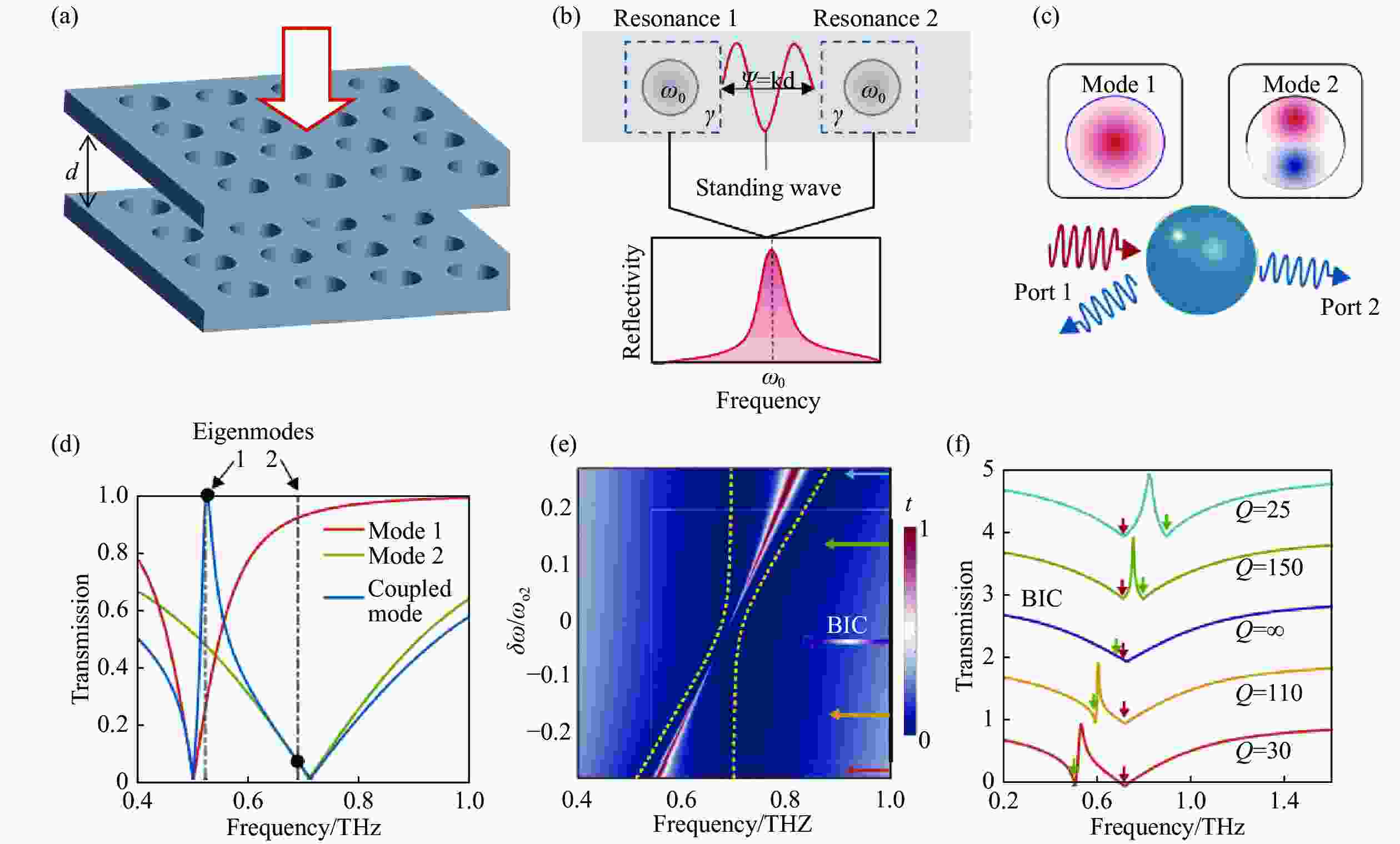 图 3 共振耦合型BIC。(a)两个完全相同的高反射光子晶体板支持的Fabry–Pérot BIC,(b)其的共振机制示意图:调节两个平板共振器距离d形成驻波;(c)单独一个周期结构器件中两个模式耦合示意图,(d)两个模式耦合成一个高Q模的辐射谱;(e)频率调谐谱,调节结构参数,两个本征频率移动并交叉,在交叉点附近,一个频率的共振阻尼将完全消失形成Friedrich–Wintgen BIC,(f)在透射光谱上该点表现为平滑的谱线。[96] © 2020 Optical Society of America