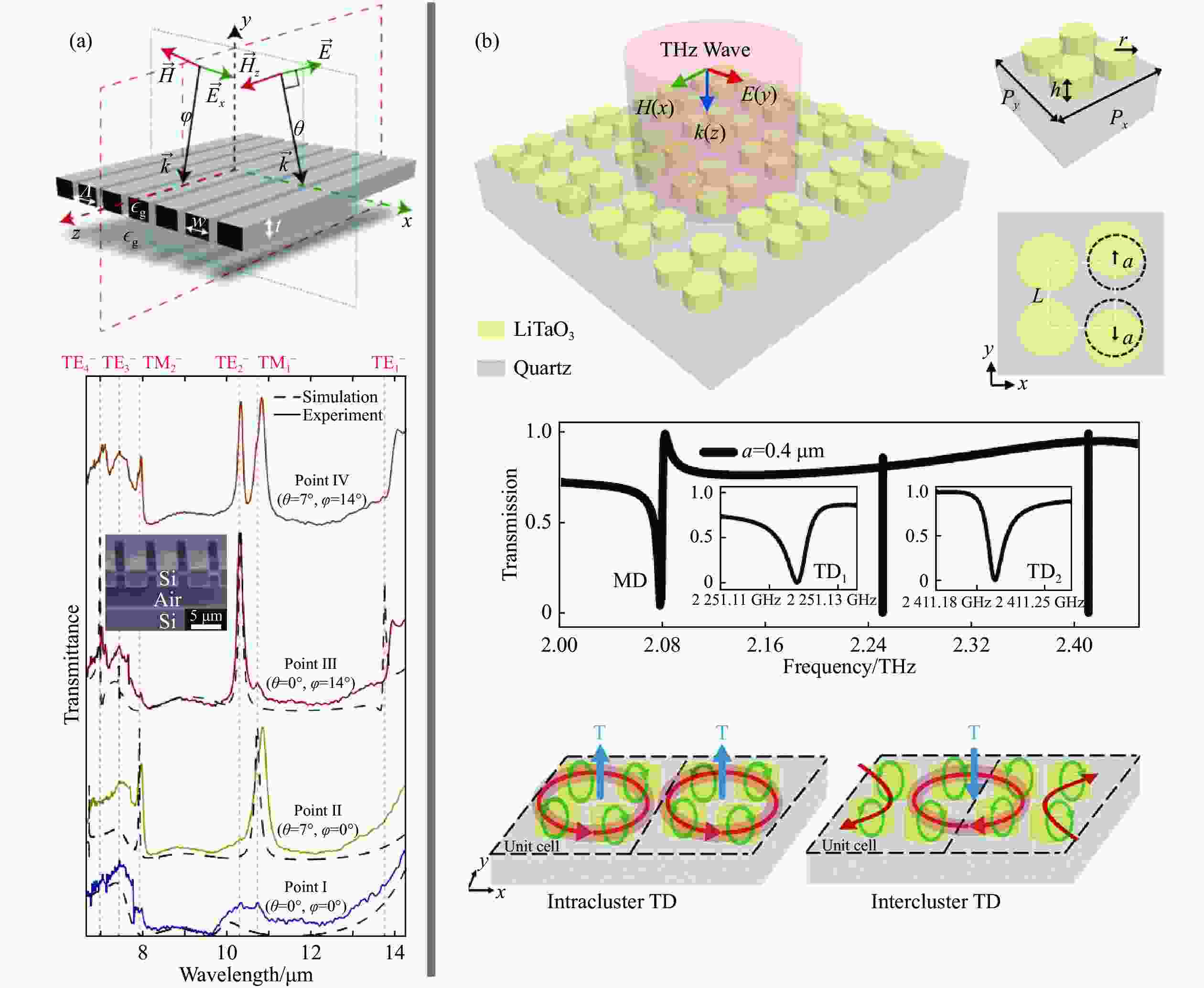 图 9 BIC在窄带滤波与传感方面的应用。(a)支持准BIC的光子晶体光栅,准BIC在低透射率背景下出现窄透射峰,实现空间窄带滤波功能[71];(b)基于全介质四聚体的准BIC高灵敏传感器平台[68]