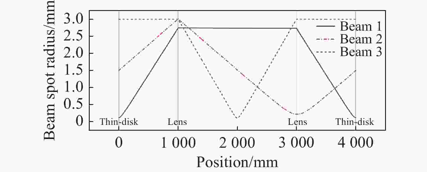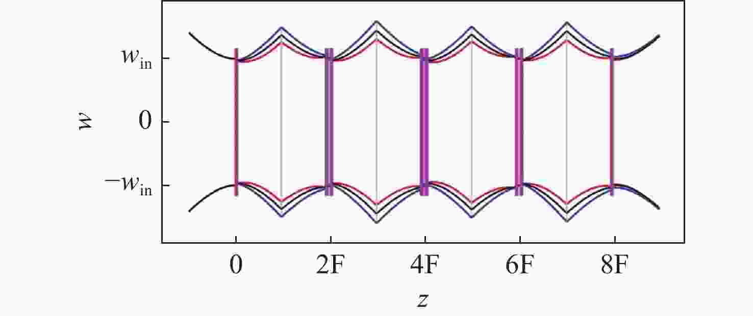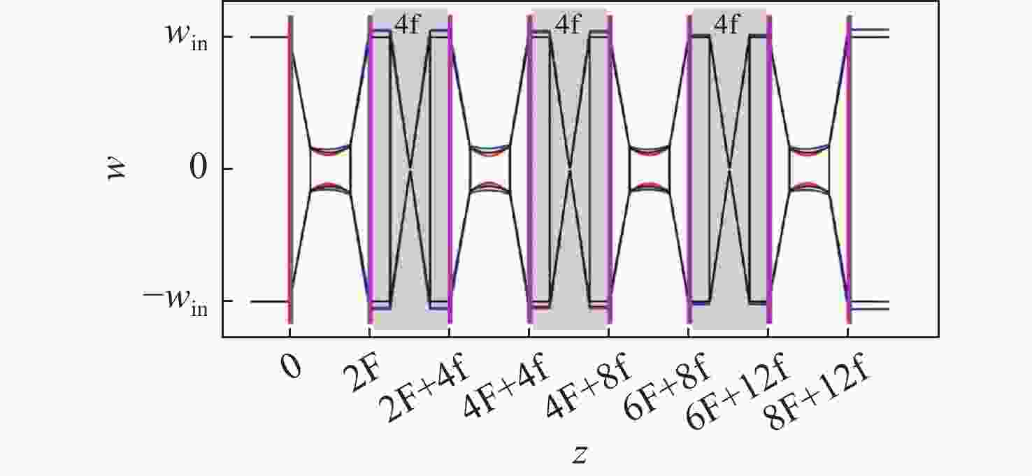 图 16 基于光学傅立叶传输的8通放大器的光束传播。(黑线代表碟片晶体光焦度为0,红线和蓝线代表碟片晶体光焦度分别为±1/(40f)的光束传播,f为4f系统的焦距)[24]