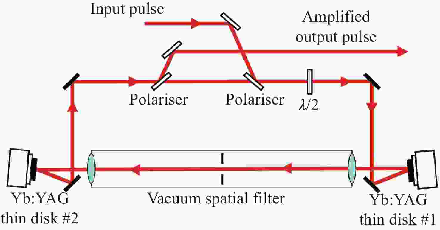 f relay imaging, (2) resonant cavity design/optical Fourier transform, (3) near-collimated beam transmission, and (4) others. Each amplifier design method is described and the current status of its research is listed in as much detail as possible. By comparing the four types of disk multi-pass amplifiers, it is found that the varying methods have distinct advantages and disadvantages. 4f relay imaging requires a vacuum environment to avoid gas ionization at the focal point, making the mechanics and adjustment more difficult; the resonant cavity design/optical Fourier transform concept multi-pass amplifier has a small spot at the mirrors, making it more suitable for lower energy multi-pass amplifiers; the near collimated beam transmission method has great development potential because it does not require a vacuum environment, but accurately controlling the surface shape of the thin-disk is difficult while the laser is operating. Therefore, from the perspective of laser design, it is necessary to continue to optimize the design of the thin-disk multi-pass amplifier to realize the diversification of application scenarios and the sustainable expansion of output energy.-