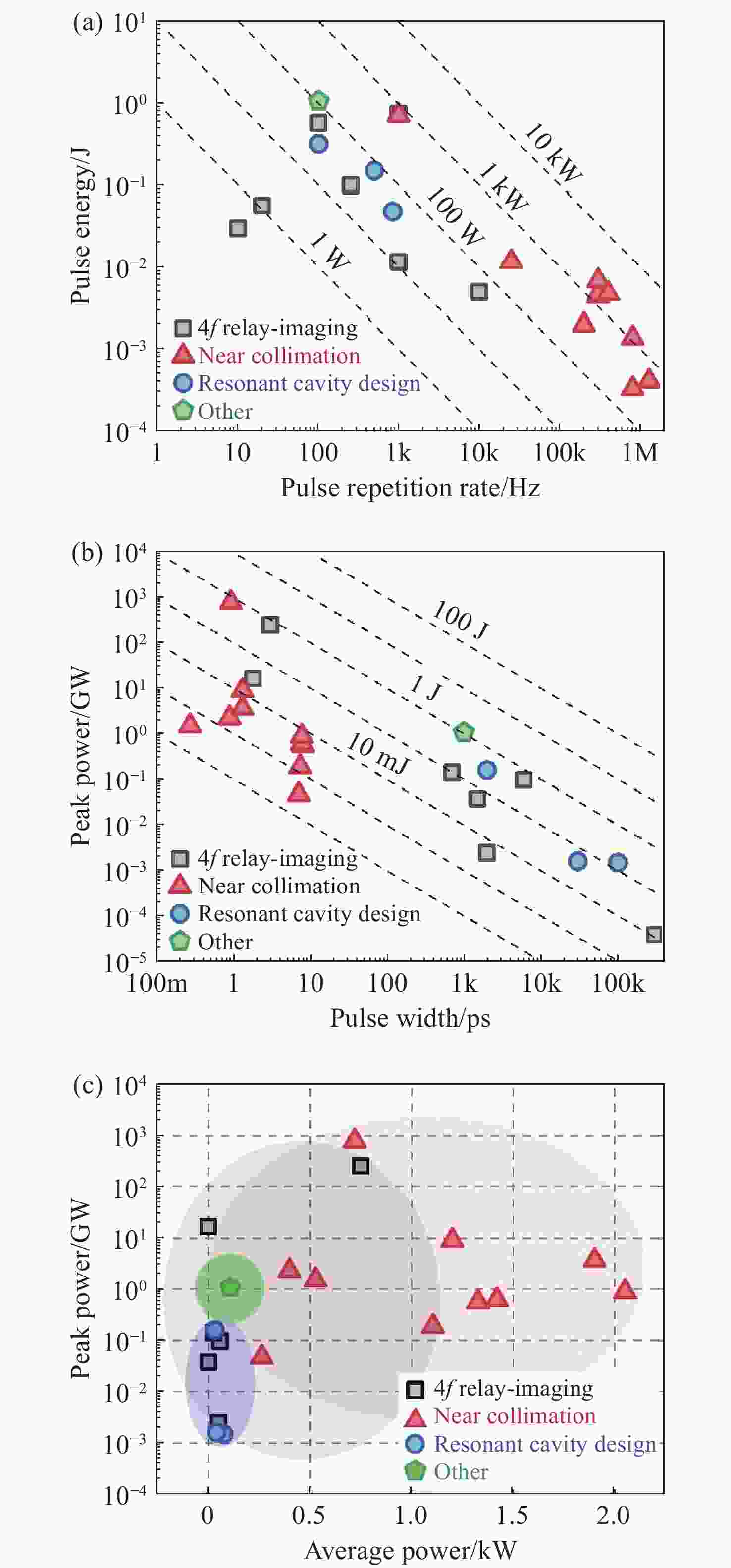 方案名称 优点 缺点 4f中继成像 任何热透镜焦距下,均能复现光斑尺寸,光路设计简单 光束发散角随热透镜焦距变化剧烈,光束焦点处容易电离空气,需要真空环境运行或令焦点位于真空管内 4f中继成像——低温制冷 单次增益高、热光性能优异,光路设计简单 需要液氮等低温制冷,同时需要真空环境 谐振腔设计/光学傅立叶变换 抗热透镜变化性能优于4f中继成像 镜片上存在较小尺寸光斑,对镜片损伤阈值要求高;未进行皮秒脉冲放大实验,停留在理论阶段 近准直光束传输 可在空气环境运行,无空气电离 需要精心设计的碟片光焦度 其他 — — -