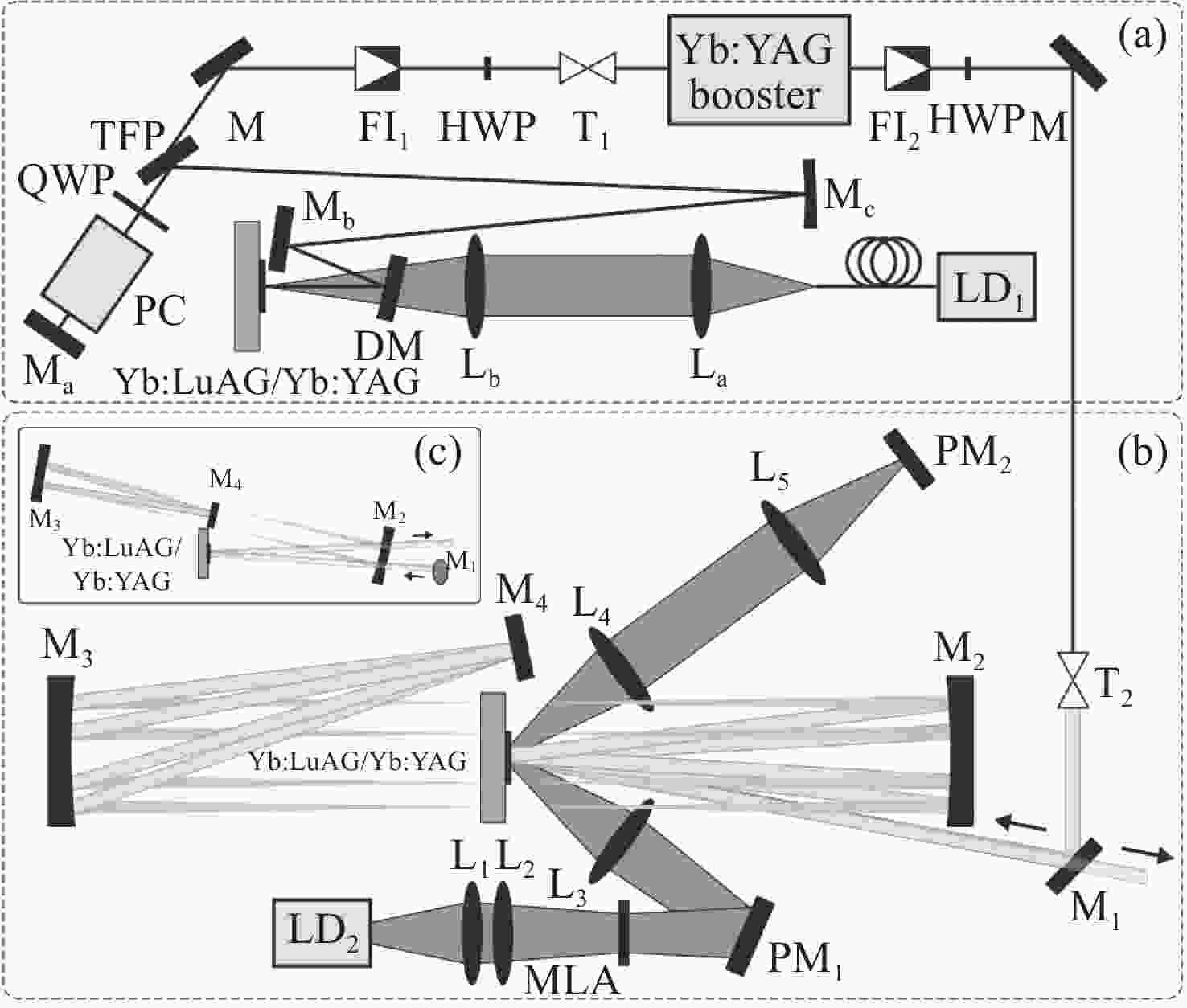 f 中继成像、谐振腔设计/光学傅立叶变换、近准直光束传输与其他共4种设计理念的多通放大器。介绍了每种放大器的设计方法并详尽列举了研究现状。通过对比4种类型的碟片多通放大器,发现不同种类的多通放大器各有优缺点。4f 中继成像需要真空环境以避免焦点处的气体电离,因此机械装置与调试难度较大;谐振腔设计/光学傅立叶变换概念多通放大器的镜片处存在较小光斑,因此较适用于较低能量的多通放大器;近准直光束传输方法由于不需要真空环境,具备很大的发展潜力,但需要精准控制激光运转状态下的碟片面形,难度也较大。因此,从激光器设计角度来看,需要对碟片多通放大器继续进行优化设计,从而同时实现使用场景的多元化与输出能量的可持续拓展。Abstract:In order to clarify the cavity design methods of thin-disk multi-pass amplifiers, we summarize the different types of thin-disk multi-pass amplifiers and concludes that there are four fundamental design concepts: (1) 4