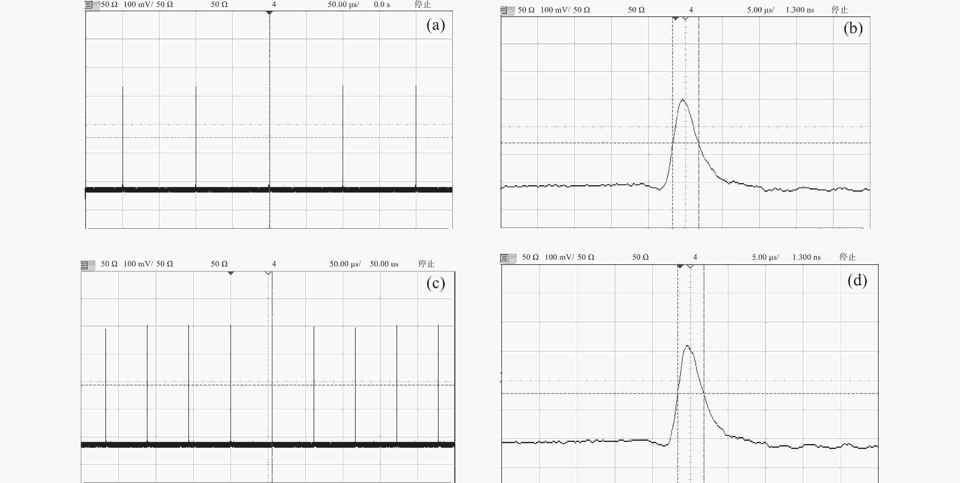 Figure 11.  Pulse sequence and pulse width of 228-nm laser. (a) Pulse sequence and (b) pulse width at 10 kHz; (c) pulse sequence and (d) pulse width at 18 kHz