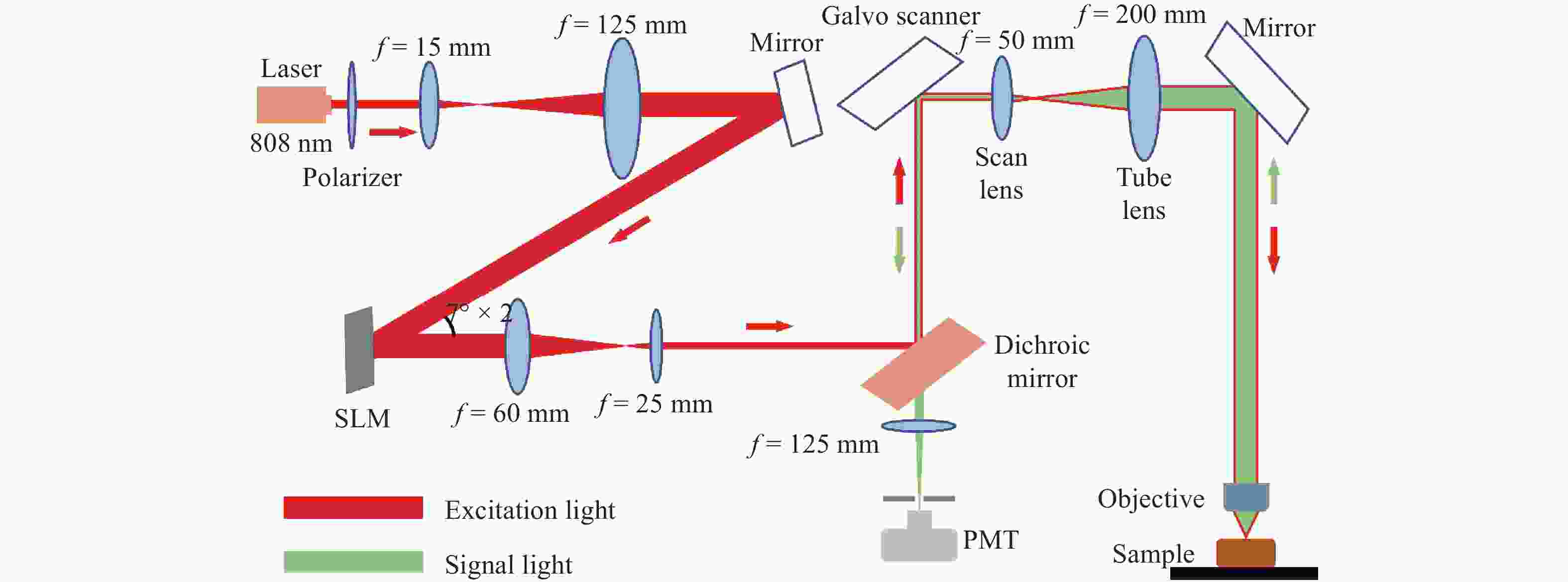 生物组织散射引起的光学像差限制了光学系统的成像性能。本文研究了基于间接波前整形的近红外二区荧光共聚焦成像技术。首先,制备了高效率近红外二区荧光探针,降低该波段生物组织的散射有助于实现高对比度的活体组织成像。其次,研究了基于间接波前测量的自适应光学方法,将间接波前整形技术应用于激光扫描共聚焦显微系统中,以实现对生物组织引起的光学像差的测量与补偿,获得生物组织的高信噪比成像。最后,对基于间接波前整形的近红外二区荧光共聚焦成像系统开展了相关实验。实验结果表明,本系统对空气平板、散射介质和小鼠颅骨等产生的像差具有良好的补偿效果,最终信号强度较初始值分别提升了1.47、1.95和2.85倍,显著提升了最终的成像质量。