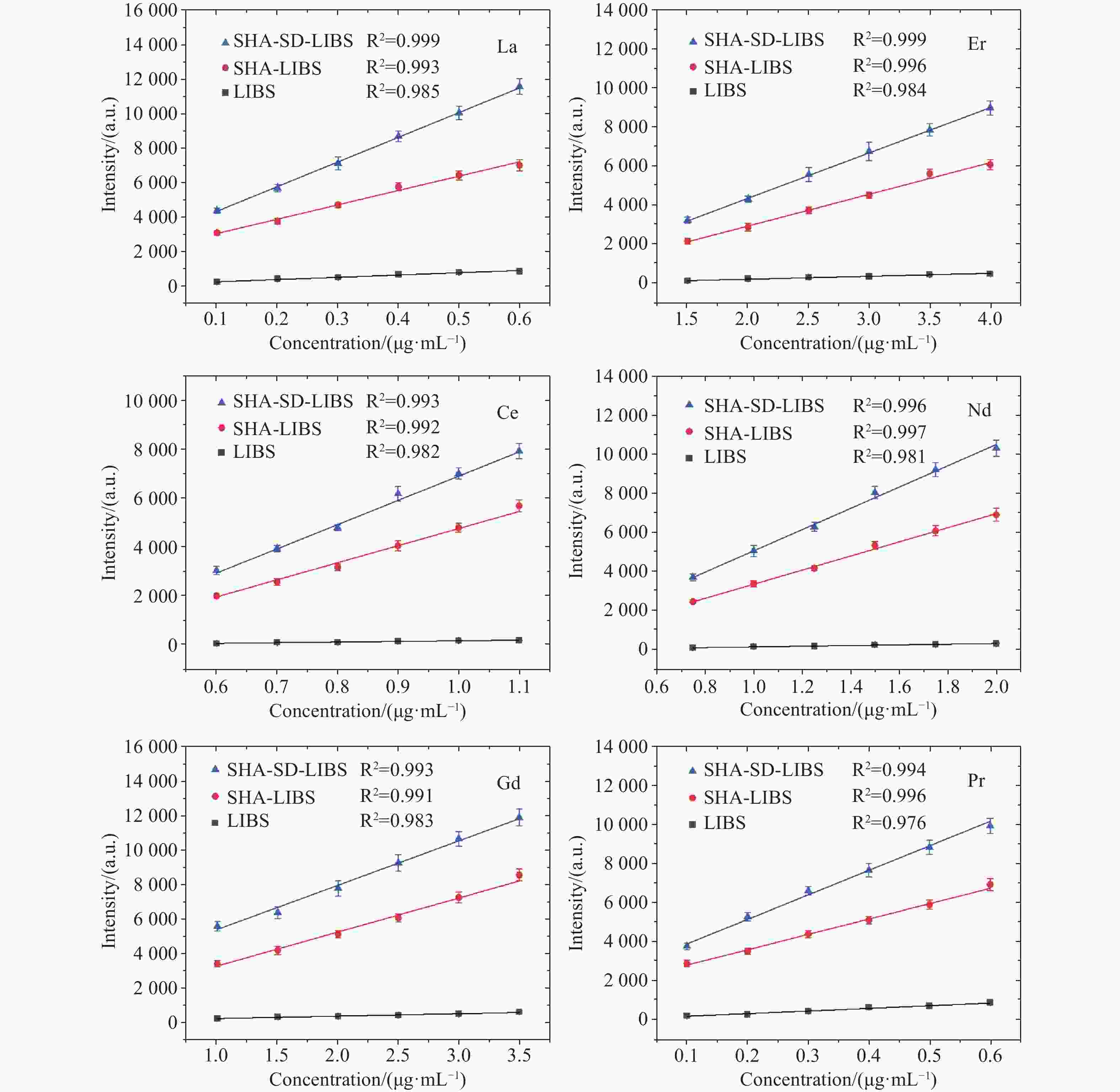 快速测定液相样品中的稀土元素(REEs)对离子吸附型稀土资源勘探与开发、萃取过程质量控制、稀土资源循环利用以及核工业废水监测等领域具有重要意义。为了降低激光诱导击穿光谱(LIBS)对液体样品中REEs的检出限,本研究采用超疏水阵列辅助电火花增强激光诱导击穿光谱法(SHA-SD-LIBS)测定液相样品中的REEs。选择最佳的实验条件,以La II 394.91 nm、Er 402.051 nm、Ce II 418.66 nm、Nd II 424.738 nm、Gd II 443.063 nm和Pr 492.46 nm作为特征谱线,对6种不同浓度的稀土元素(La、Er、Ce、Nd、Gd、Pr)溶液建立标定曲线进行定量分析。结果表明,各标定曲线拟合系数