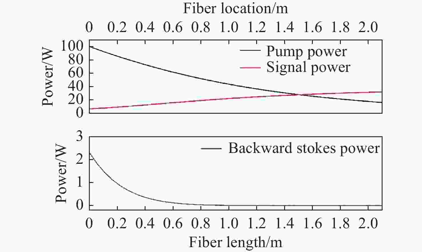理论分析了波长为2 µm的掺铥光纤放大器中受激布里渊散射(SBS)对激光输出性能的影响,研究了双包层掺铥光纤在793 nm的泵浦波长和1.9~2.1 µm的激光工作波段的光模分布、有效折射率、有效模场面积和归一化频率,数值计算了在1.9~2.1µm的激光工作波段双包层掺铥光纤中的布里渊频移和布里渊增益谱等SBS特性。利用增益光纤中的受激布里渊散射理论模型,研究了受激布里渊散射对掺铥光纤放大器激光输出性能的影响。在DTDF-10/130双包层掺铥光纤中,使用功率为100 W、波长为793 nm的连续光作为泵浦,可对波长为2 μm、功率为0.01 W的连续信号光进行放大。当泵浦光功率填充因子为0.01、0.02和0.03时,信号光的最大输出功率分别为25.27 W、31.08 W和34.06 W。对应的最佳双包层光纤长度为2.66 m、2.02 m和1.75 m,由受激布里渊散射产生的斯托克斯光功率分别为1.68 W、1.39 W和1.14 W。结果表明,在掺铥光纤放大器中使用泵浦光功率填充因子大的双包层光纤可以降低光纤长度,从而减小受激布里渊散射对信号激光输出功率的影响。本文的数值模型可以对光纤放大器的光纤长度进行优化,对提高实验效率、降低实验成本具有重要价值。