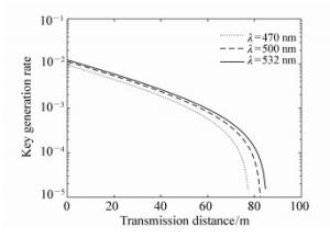 摘要: 针对空-水量子密钥分发(Quantum Key Distribution,QKD),综合考虑海风影响、泡沫覆盖的不规则海面、空-水信道复杂多变性和量子偏振态多重散射过程,建立了非均匀空-水信道复合模型。据此完善了空-水QKD系统量子误码率理论模型,并采用偏振矢量蒙特卡罗算法模拟,详细分析了不同海洋环境下非均匀空-水信道光量子传输性能,及空-水QKD整体传输性能。结果表明:清澈海水条件下的非均匀空-水信道可实现水下百米量级的密钥分发,但风速和传输距离的增大都会导致光子退偏比增大,保真度减小,偏振误码率增加;同时风速和泡沫层厚度的增大也会造成空-水QKD系统量子误码率上升,密钥生成率和传输距离下降,且随信号波长的增加这两者也会增加,在波长为532 nm,信道由最佳(无风无泡沫)变至最差(暴风且泡沫层为6 cm)时,水下传输距离由120.8 m缩减至85 m,基本能保障水下航行器百米级的安全潜深,而采用拖拽浮标等措施又可进一步增加空-水QKD的安全距离。由此验证了泡沫覆盖不规则海面下非均匀空-水信道诱骗态QKD的可行性,对未来空-水一体量子通信链路的实现具有参考价值。Abstract: For air-water Quantum Key Distribution(QKD), considering the effects of sea breeze, irregular sea surfaces with foam, the complicacy and variety of air-water channels and multiple scattering processes of the polarized quantum state, a heterogeneous air-water channel composite model is established. Based on this, the theoretical model of the error rate of air-water QKD systems is improved. Then, through a polarization vector Monte Carlo simulation, the transmission characteristics of photons in heterogeneous air-water channels and the overall transmission performance of air-water QKDs under different marine environments are analyzed in detail. The results show that heterogeneous air-water channels under clear seawater conditions can achieve a key distribution of 100 meters underwater, but the increase of wind speed and transmission distance will lead to an increase in the photon depolarization ratio and a decrease in fidelity, thereby increasing the polarization error rate. Meanwhile, the rise of wind speed and foam layer thickness adds the quantum error rate of air-water QKD systems and decreases the key generation rate and transmission distance. Both of these factors increase with an increase in signal wavelength. When the wavelength is 532 nm and the channel changes from best(no wind and foam) to worst(storm and foam layer thickness of 6 cm) conditions, the underwater transmission distance is shortened from 120.8 m to 85 m. It can guarantee a 100 m safety depth in underwater vehicles and alternate contingencies such as dragging the buoy can further increase the safety distance of air-water QKD. Therefore, this paper verifies the feasibility of a decoy QKD in a heterogeneous air-water channel with a foam-irregular sea surface and acts as a significant reference for future technologies in air-water integrated quantum communication links.