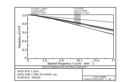 In order to meet the requirement of compact structure and athermal stability with wide temperature range, a middle infrared catadioptric optical system is designed. According to the requirements of other guided modes, the focal length and aperture of the primary mirror is fixed. The height of the principal ray reaching the relay system can be reduced. The aperture of the lens can be decreased, which will lower the cost. A compact infrared imaging system with a wavelength 3.7-4.8 μm, focal length <em>f</em>=300 mm, <em>F</em> number 2, is presented in this paper. The results show that the system performs well and the optical transfer function of each field is close to the diffraction limit. Between -50-70℃, passive optical athermalization can be realized in this system. For this system, the tolerance analysis and some ways of resisting the stray light are presented at last. It shows that the MIR system meet the demand of actual processing and application.