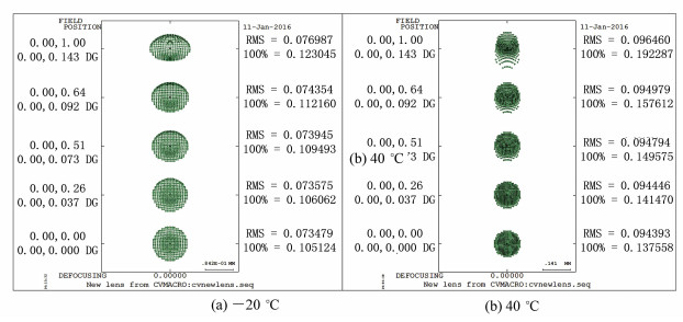 In order to ensure the stable tracking accuracy of the photoelectric tracking and aiming system of the mobile ground station in the complex environment in the field, the optical system and optical structure are designed to solve the problem of imaging spot dispersion of the beacon receiving lens under the working temperature width of -20~40℃. A temperature compensation scheme for driving the compensation lens group with a stepping motor is proposed. The change of optical system performance under extreme temperature conditions and the effect of different temperature compensation schemes are analyzed. According to the requirements of photoelectric tracking and aiming system, the opto-mechanical structure is designed and the mechanical and optical properties are analyzed. The analysis results show that the first-order mode of the system is 370 Hz; the compensation lens group moves forward by 0.695 mm to compensate the dispersion of the optical system imaging spot at -20℃, and the central field spot size is reduced from 73 μm to 3.2 μm and the edge field spot size is reduced from 77 μm to 15.7 μm; moving back 0.885 6 mm can compensate for the dispersion of the imaging spot at 40℃, reducing the central field spot size from 94 μm to 3.9 μm, and the edge field spot size from 96 μm to 21.8 μm. The image quality of the optical system is also detected using a ZYGO interferometer. The RMS (root mean square) valueof the wave aberration is 0.061λ (λ=632.8 nm), and the PV (peak-to-valley) value is 0.466λ, which can satisfy the index requirements of the tracking and aiming system.
