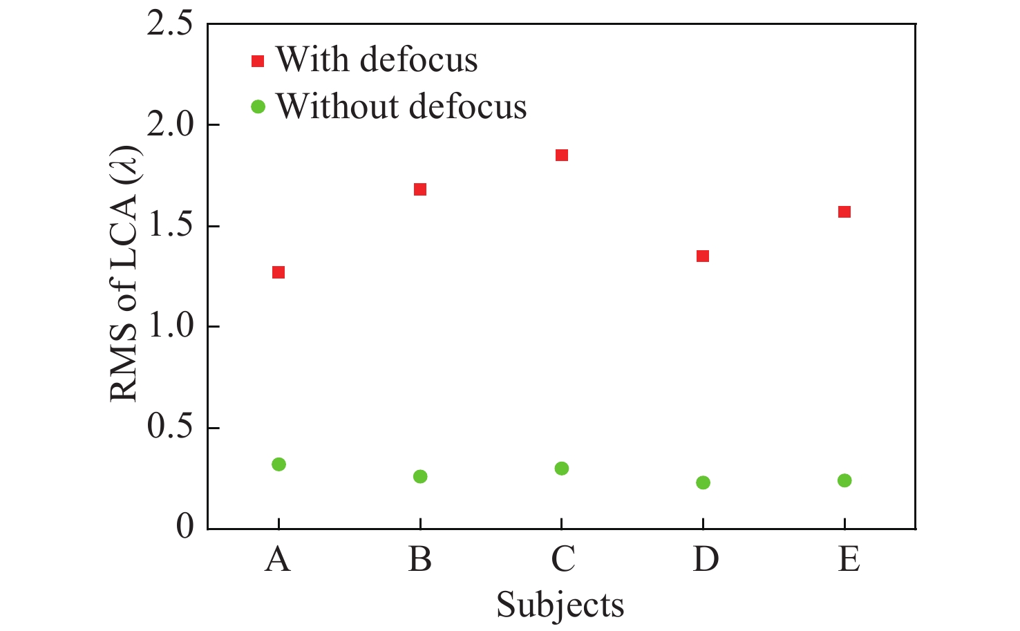 Dual-wavelength retinal imaging adaptive optics systems are suitable for high contrast and resolution imaging of retinal capillaries. The compensation of the Longitudinal Chromatic Aberrations (LCAs) in dual-wavelength adaptive systems is researched. The LCA is measured, the measured wavefronts are analyzed, and the arbitrary wavefront LCA compensation method is given. An adaptive correction experiment is carried out and the experimental results indicate that the root mean square error of the wavefront is reduced to 0.16 λ (λ=589 nm) and the retinal capillary resolution is improved to 6 μm. This work may be used for the clinical applications of retinal imaging.