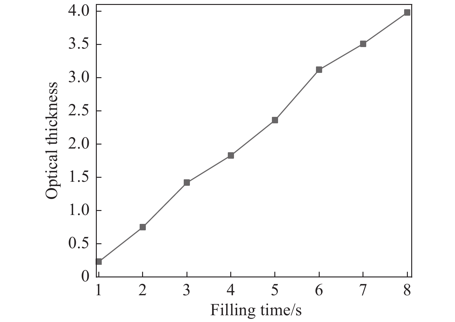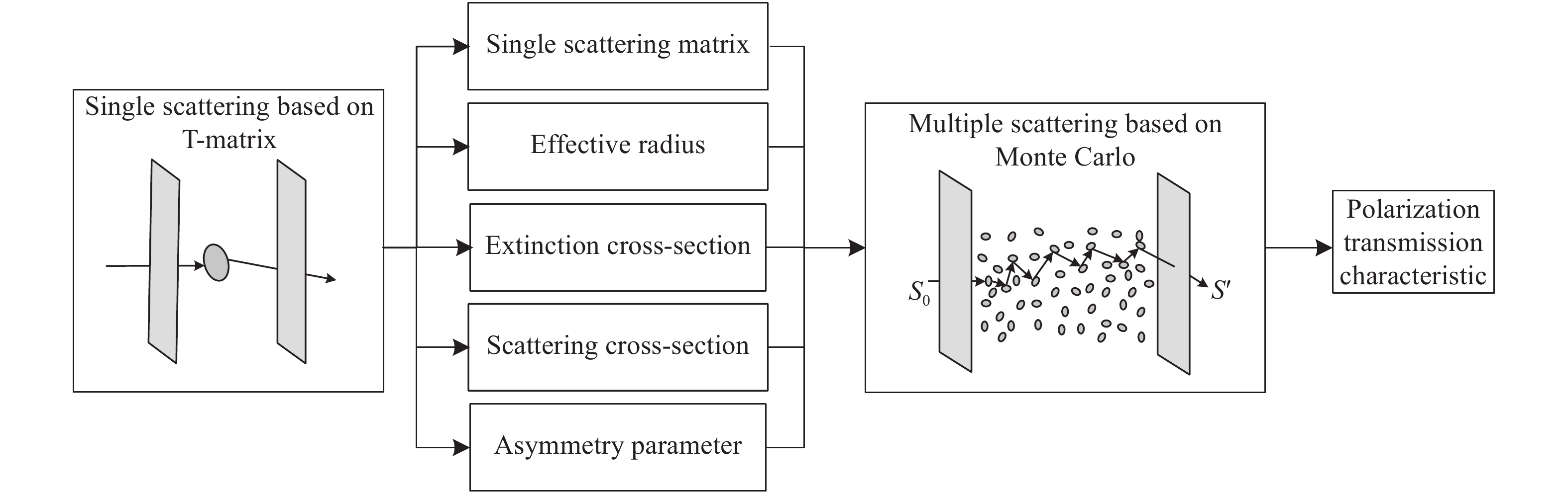To investigate the multiple scattering transmission characteristics of polarized light in ellipsoidal fine particles, a simulation and experiment verification system for black carbon aerosol particles was established. The polarization transmission characteristic after multiple scattering of the randomly oriented ellipsoidal fine particles are studied by combining the T-matrix with the Monte Carlo method. A half-real simulation testing environment was established to verify the simulation algorithm, and the ellipsoidal fine particles were prepared by extending ganoderma lucidum spores′ burning time. The size distribution and optical thickness of the ellipsoidal fine particles were measured by Malvern Spraytec and a light power meter, respectively. The simulation results can be proven by combining the experiment with the simulation. The results show that with an increase in the concentration of black carbon ellipsoidal fine particles, the Degree Of Polarization (DOP) of the horizontal, vertical, 45° linearly polarized and the right circularly polarized light all decrease, and the polarization preservation ability of three kinds of linear polarizations are basically consistent. The polarization preservation ability of the circularly polarized light gradually exceeds the linearly polarized light with an increase in concentration. The gap between the linear and circular polarizations becomes larger as it reaches its maximum value at 3.12 optical thickness. When the optical thickness is greater than 3.12, the DOP difference between the circularly and the linearly polarized lights tend to be stable. By calculation, the percent agreement between the simulation and the experiment is better than 70.84%. These results can expand the environmental applicable range of polarization detection and provide theoretical support for studying the polarization detection of atmospheric non-spherical particles.