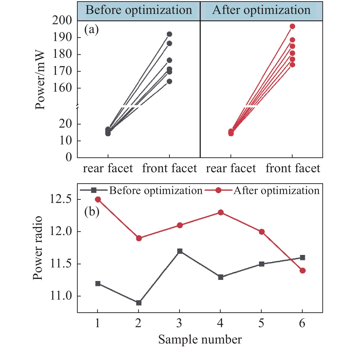 The cavity surface optical film is one of the most crucial components of the fiber bragg grating External Cavity diode Laser (ECL). Although, the Plane Wave Method (PWM) is widely used in the optical film preparation, it is not an ideal design method when applied in ECL preparation. The Finite-Difference Time-Domain (FDTD) method is used to analyze this problem by taking the effect of facet dimensions and structure into account. According to the simulation, PWM suffers from poor reflectivity and deviation of the reflection curve, which significantly affects performance. Therefore, the optical film design is optimized and verified by experiments. Magnetron sputtering is used to fabricate the optical film, which is then applied to ECL. The measurement results show that the reflectivity of Anti-Reflection (AR) film is reduced by 30% after optimization, while the reflectivity of High-Reflection (HR) film increased to 96%. The prepared ECL’s fiber output power exceeds 650 mW. In this paper, the optical film suitable for ECL is designed and fabricated, and provides a reference for optical films in ECLs and other semiconductor optoelectronic devices.