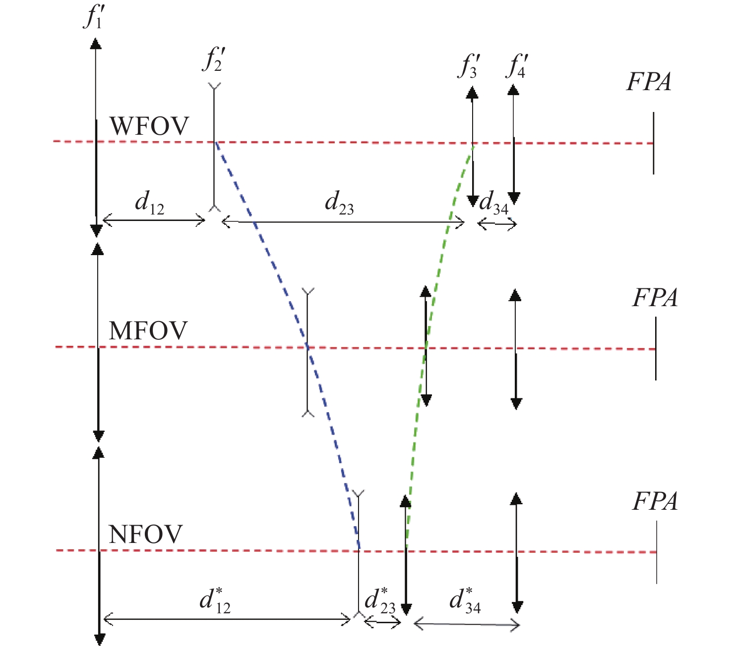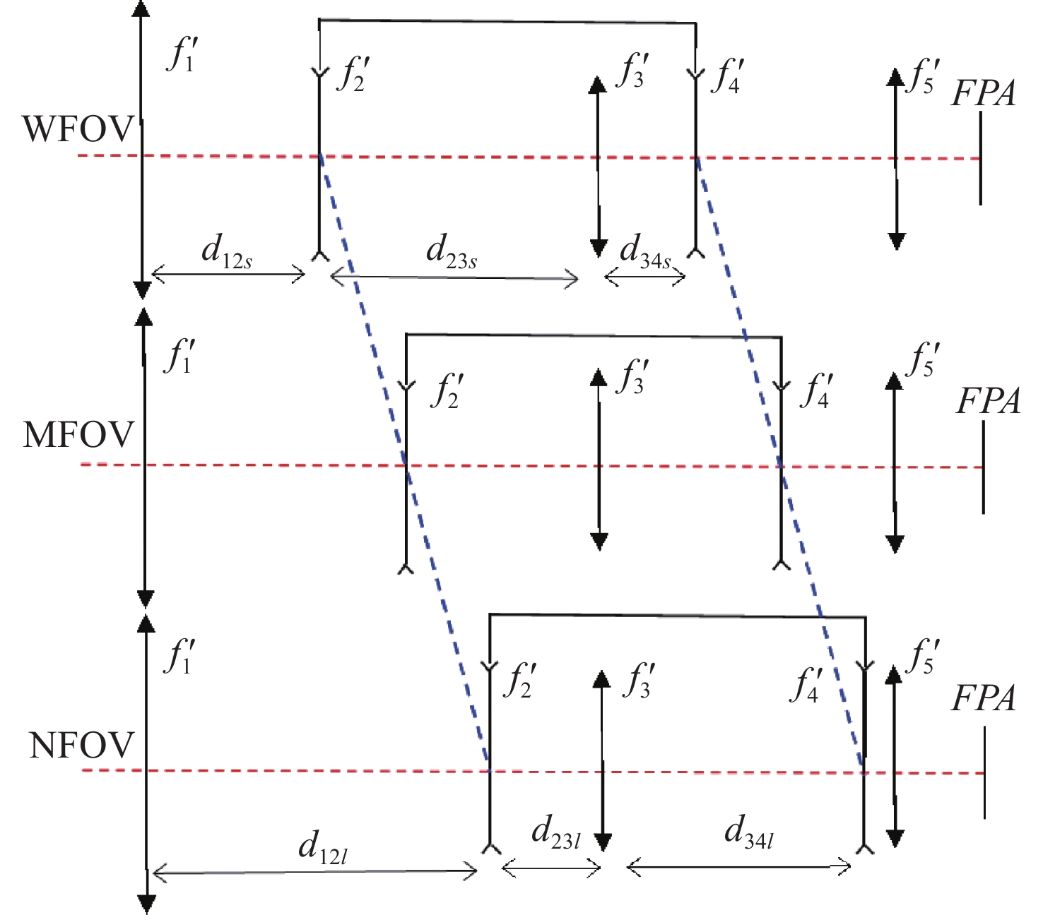 Compared with the medium-wave Infrared (MWIR) zoom optical system, the long-wave infrared (LWIR) zoom optical system has fewer available materials and is difficult to athermalize in high and low temperature environments. In this paper, the multi-field zoom optical system is realized by using mechanical compensation zoom technology, and the active compensation athermalization technology is used to make the system image clear in the temperature range of −40 °C—+65 °C, to realize the design of the four-field LWIR optical system with four lenses. The focal lengths of the four fields of view are 25 mm, 109 mm, 275 mm and 400 mm, the zoom ratio is 15, the envelope size of the optical system is 280 mm (L)×200 mm (W), and the total weight of the optical components is 618 g. The optical system has SWaP-C characteristics such as light weight, high performance, and low cost, and will be widely used in security fields such as auxiliary navigation, search, and tracking.