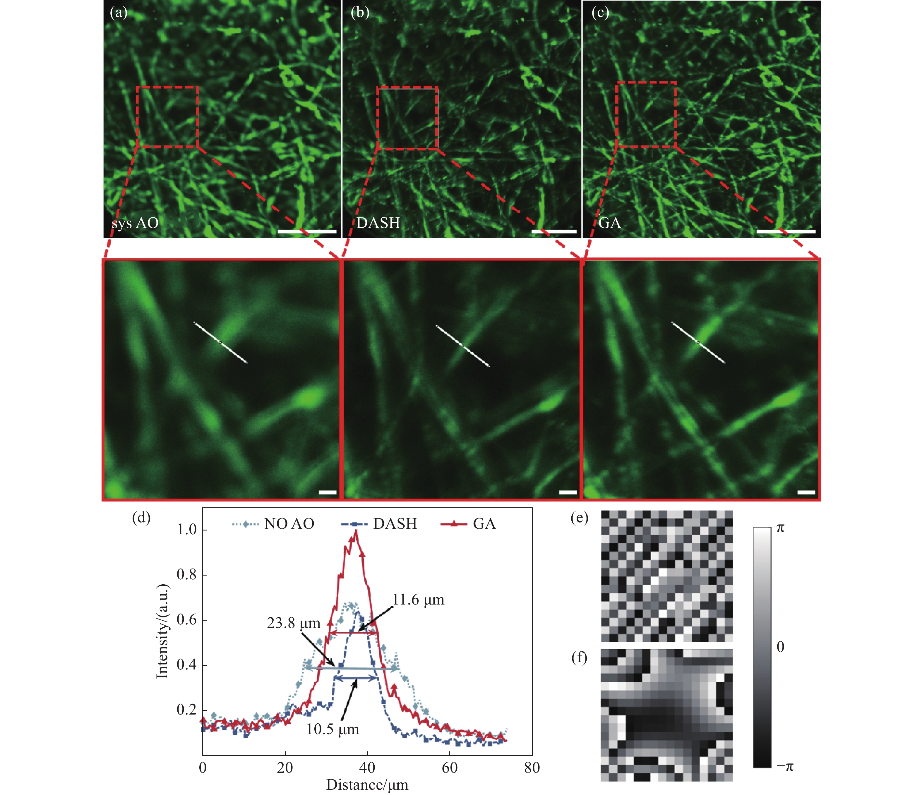 Optical aberrations caused by the scattering of biological tissues limit the imaging performance of optical systems. A near-infrared II fluorescence confocal imaging technique based on indirect wavefront shaping was investigated. First, we synthesized a highly efficient near-infrared II range fluorescent probe, where reducing the scattering of biological tissue can realize biopsy imaging with high-contrast. Second, we investigated the adaptive optical method based on indirect wavefront measurement. The indirect wavefront shaping technology was applied to the laser scanning confocal system, enabling the measurement and compensation of optical aberrations caused by biological tissues, and obtaining imaging of biological tissues with a high signal-to-noise ratio. Finally, near-infrared II fluorescence confocal imaging system based on indirect wavefront shaping was deployed and relevant experiments were conducted. The experimental results indicate that the system effectively compensates for the aberrations induced by air plates, scattering media and mouse skull, and increases the final signal intensity by 1.47, 1.95 and 2.85 times, respectively. As a result, the final imaging quality is significantly enhanced.