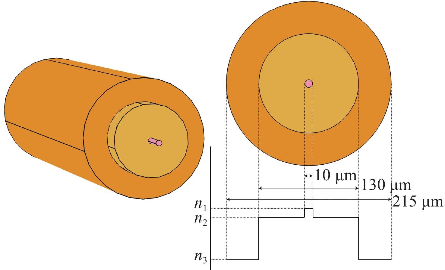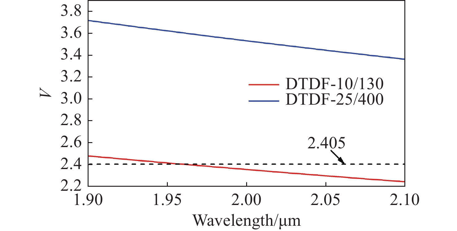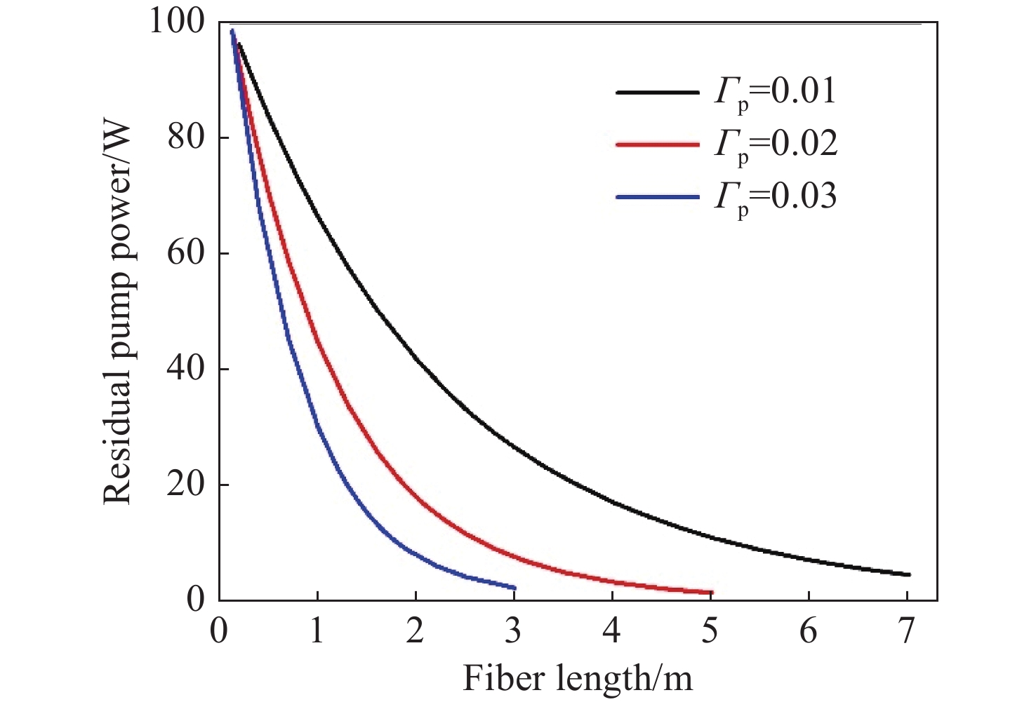 In this paper, the effect of Stimulated Brillouin Scattering(SBS) on the laser output performance in a 2 µm thulium-doped fiber amplifier was analyzed theoretically. The optical mode distribution, the effective refractive index, the effective mode field area, and the normalized frequency of the double-clad thulium-doped fiber at 793 nm pump wavelength and 1.9−2.1 µm laser waveband were studied. The stimulated Brillouin scattering characteristics, including the Brillouin frequency shift and the Brillouin gain spectrum, in the double-clad thulium-doped fiber were numerically simulated in the laser waveband of 1.9−2.1 µm. The influence of stimulated Brillouin scattering on the laser output performance of thulium-doped fiber amplifiers was investigated using the theoretical model of stimulated Brillouin scattering in gain fibers. In the DTDF-10/130 double-clad thulium-doped fiber, a continuous wave with power of 100 W and wavelength of 793 nm is used as a pump to amplify a continuous signal wave with wavelength of 2 µm and power of 0.01 W. The maximum output powers of the signal wave are 25.27 W, 31.08 W and 34.06 W when the pump power filling factors are 0.01, 0.02 and 0.03, respectively. The corresponding optimal double-clad fiber lengths are 2.66 m, 2.02 m and 1.75 m. Additionally, the Stokes optical powers generated by the stimulated Brillouin scattering are 1.68 W, 1.39 W and 1.14 W, respectively. The results show that the double-clad fiber with large pump power filling factor in the thulium-doped fiber amplifier can effectively reduce the fiber length, thus to minimize the influence of stimulated Brillouin scattering on the output power of the signal laser. The numerical model can optimize the fiber length of the fiber amplifier, which is of great significance to improve experimental efficiency and reduce experimental costs.