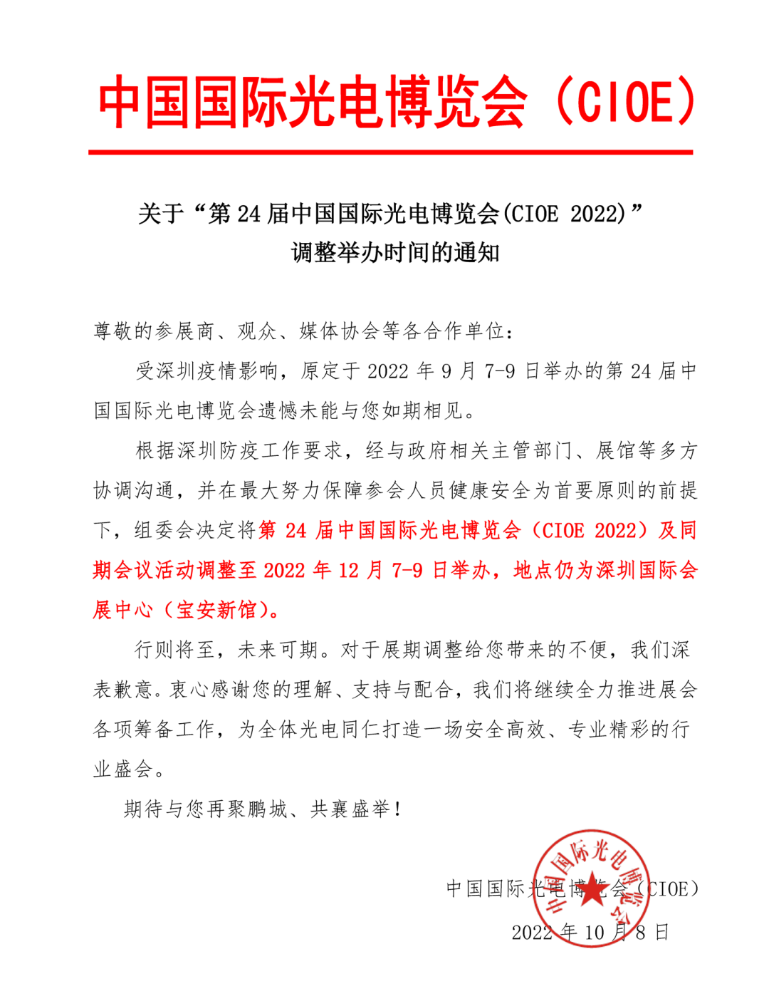 根据深圳防疫工作要求,经与政府相关主管部门、展馆等多方协调沟通,并在最大努力保障参会人员健康安全为首要原则的前提下,组委会决定将第24届中国国际光电博览会(CIOE 2022)及同期会议活动调整至2022年12月7-9日举办,地点仍为深圳国际会展中心(宝安新馆)。