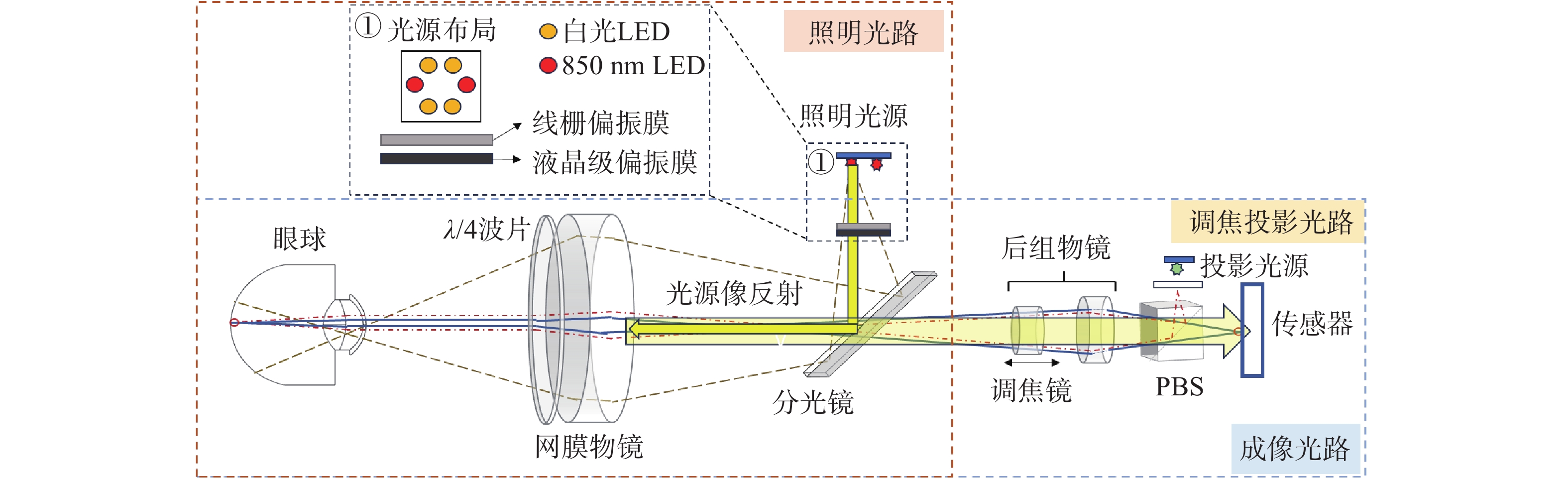 针对传统便携式免散瞳眼底相机存在照明与成像光路相互制约、角膜杂散光干扰严重、视网膜不同区域难以同时清晰成像等问题,本文提出一种新型眼底光学系统设计方案。该方案采用四点光源矩形布局与分区域亮度可调的照明方式,在3.2 mm瞳孔直径下使角膜杂散光较传统方法减少91.56%,并可实现视盘与黄斑区域的高对比度同步成像。系统通过照明光路与成像光路分离设计,结合线栅与液晶叠层偏振技术,有效抑制了光学表面反射杂光。在230.4 mm×90 mm紧凑型结构内同步实现53°大视场、±20 D屈光补偿,及6 μm的眼底分辨率。本系统通过单次拍摄人眼即可获得视盘与黄斑细节清晰、对比度优良的视网膜图像。