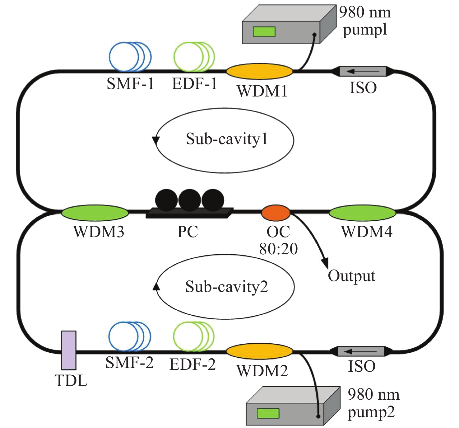 本文设计并提出了一种被动同步锁模光纤激光器。该系统采用了双腔结构,并以非线性偏振旋转(NPR)机制作为锁模方式。通过协同控制两个对称子腔内的增益、偏振和光程长度,实现了稳定的同步锁模。实验表明,通过时间延迟线(TDL)可以调节子腔的重复频率,以此来实现同步锁模。实验结果揭示了多个光谱峰和等间距的脉冲序列,证实了在单一重复频率下稳定的多波长脉冲生成。这些研究在光通信、光谱分析和远程传感等领域具有广泛应用,为开发高性能多波长超短脉冲光源奠定了基础。