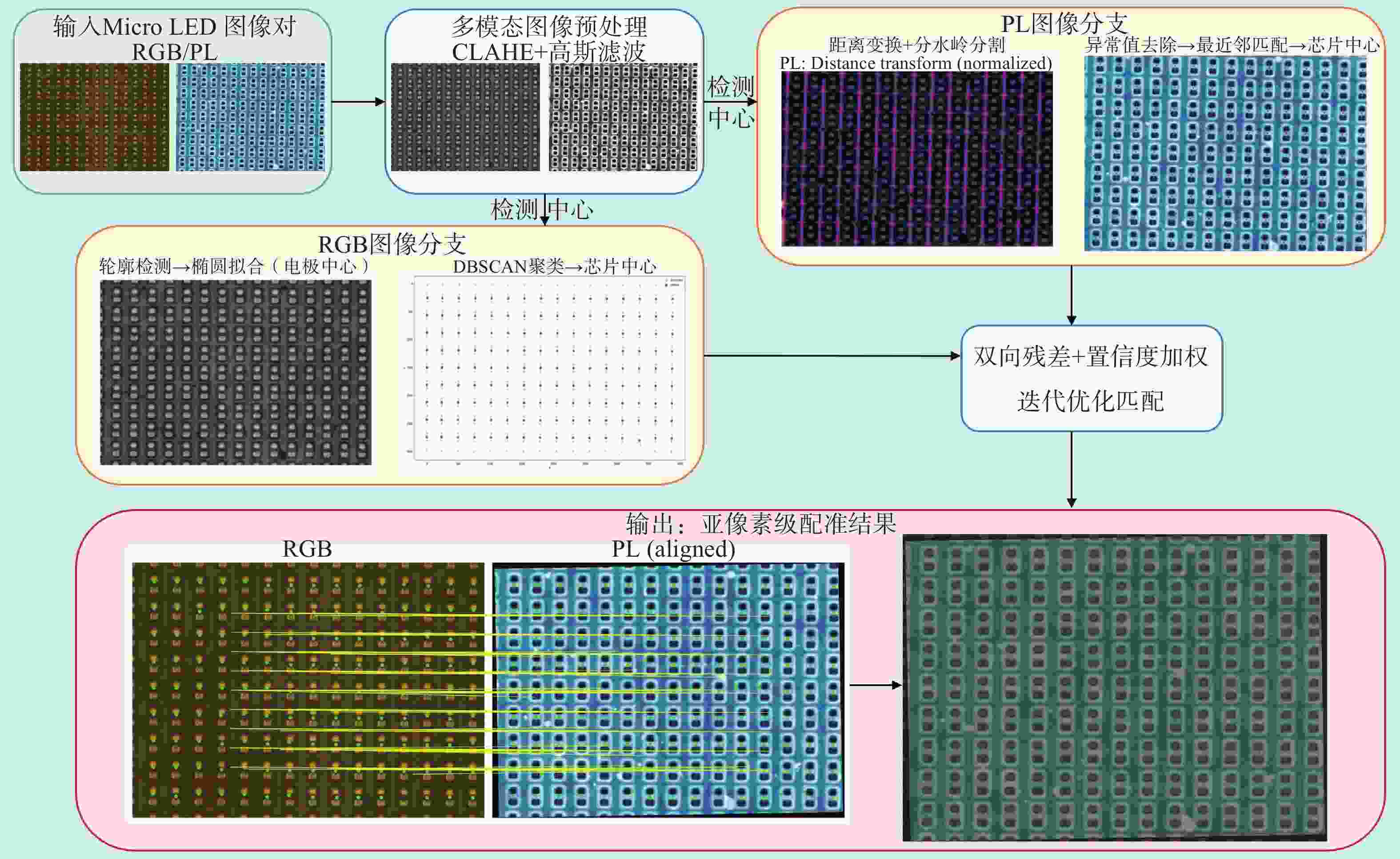 针对Micro LED缺陷检测中可见光(RGB)与光致发光(Photoluminescence, PL)图像因模态差异较大而难以实现高精度配准的难题,本研究致力于开发一种具备亚像素级精度和高鲁棒性的多模态图像配准方法,从而建立芯片物理结构与电学性能之间的映射关系。我们提出了一种结合结构特征约束与双向残差优化的配准方法:首先,基于Micro LED规则阵列的几何特性,设计了差异化的特征检测策略:在RGB图像中,通过椭圆拟合和基于密度的空间聚类算法(Density-Based Spatial Clustering of Applications with Noise, DBSCAN)精确提取电极中心;而在PL图像中,则采用改进的分水岭算法结合亚像素精修技术来定位芯片中心。其次,在配准优化阶段构建了双向残差约束框架,并引入基于残差分布的置信度加权机制,通过迭代重加权最小二乘法求解最优仿射变换参数。实验结果表明,本方法的平均绝对误差(Mean Absolute Error, MAE)为0.823像素,达到了亚像素级精度;与基线方法相比,MAE显著降低了94.2%。同时,均方根误差(Root Mean Square Error, RMSE)为0.996像素,最大误差(Max Error)控制在2.839像素以内,内点率达到75.0%,单次配准平均耗时仅为0.036秒,与互信息(Mutual Information, MI)等传统方法相比,运行效率实现了数量级提升。基于上述策略,本方法有效克服了多模态图像中的特征失配和异常点干扰问题,在配准精度、鲁棒性和效率方面均优于传统方法,为Micro LED芯片的精确缺陷检测与多模态分析提供了可靠的技术基础。