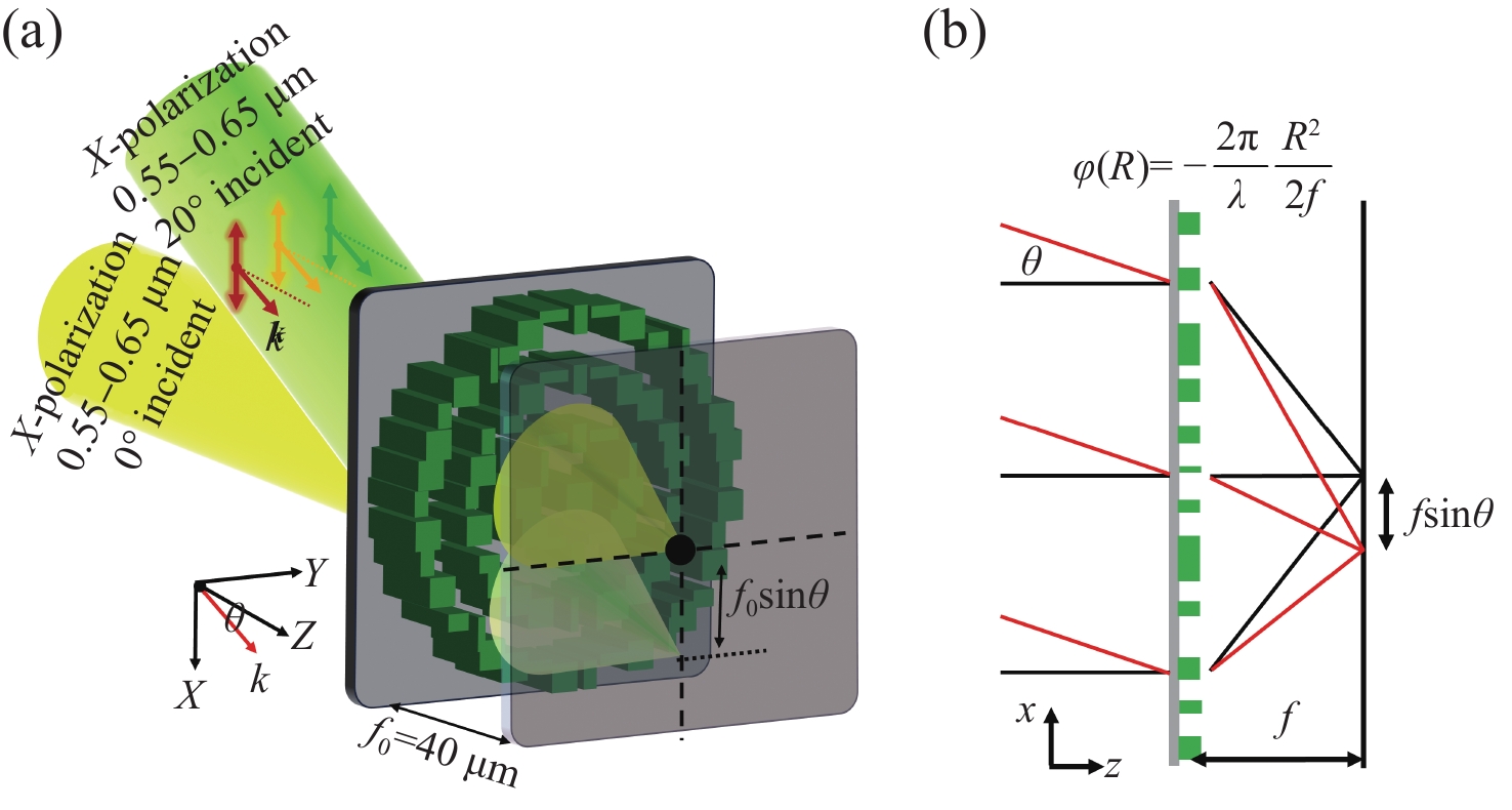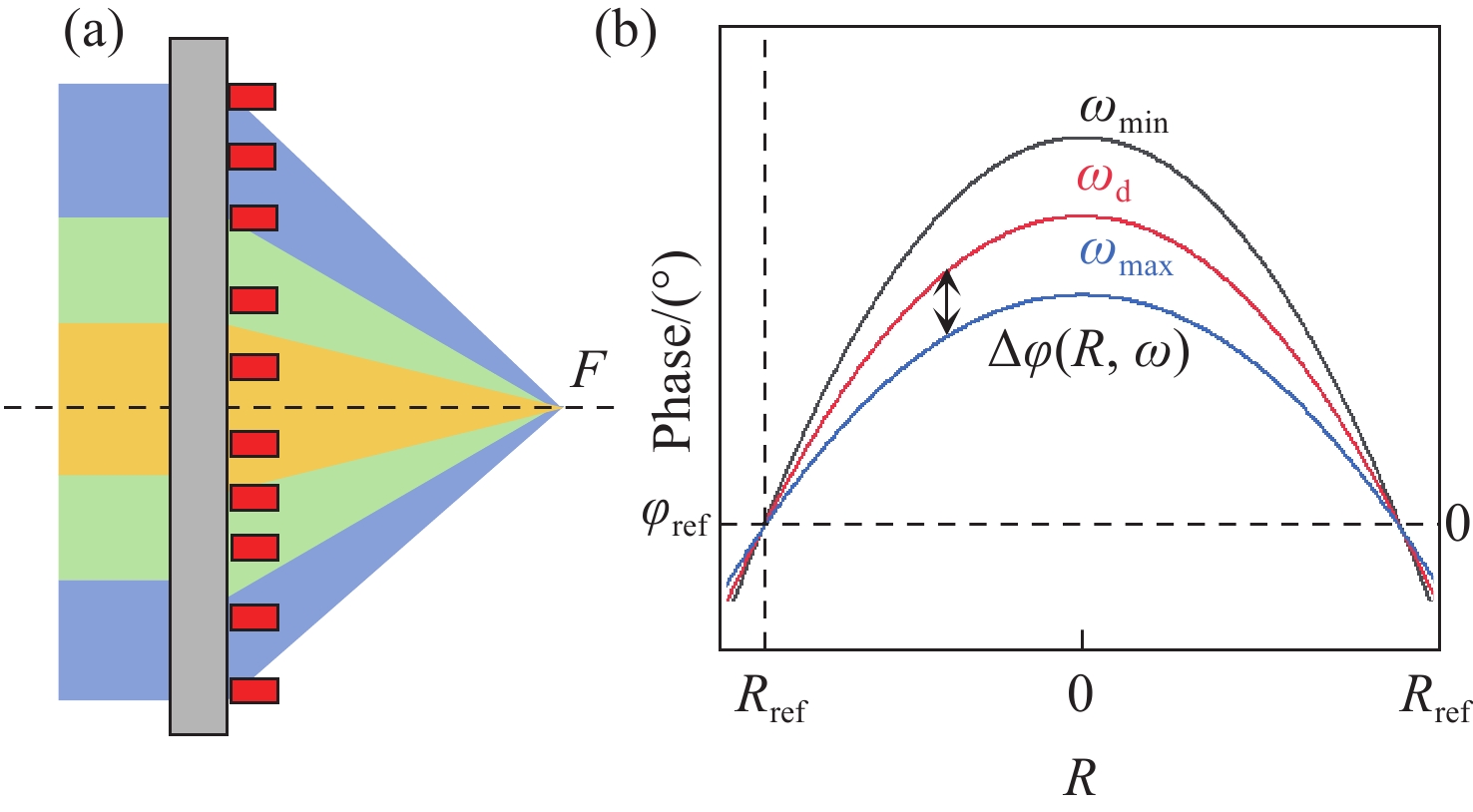 超构表面透镜存在离轴像差和材料色散,在成像探测领域无法同时兼顾视场和工作带宽。本文基于单片超构表面构建可见光大视场消色差超透镜。采用二次型相位实现大视场探测,进一步通过粒子群算法(particle swarm optimization, PSO)优化超构表面单元结构传输相位,实现连续波段色散调控,在满足大视场的前提下拓展了工作带宽。对于数值孔径为0.351的单片超构表面透镜,在0.55 μm~0.65 μm波段内实现了±20°视场角的消色差光场聚焦。在工作波段和视场范围内焦距纵向误差≤3.2 μm(~0.08