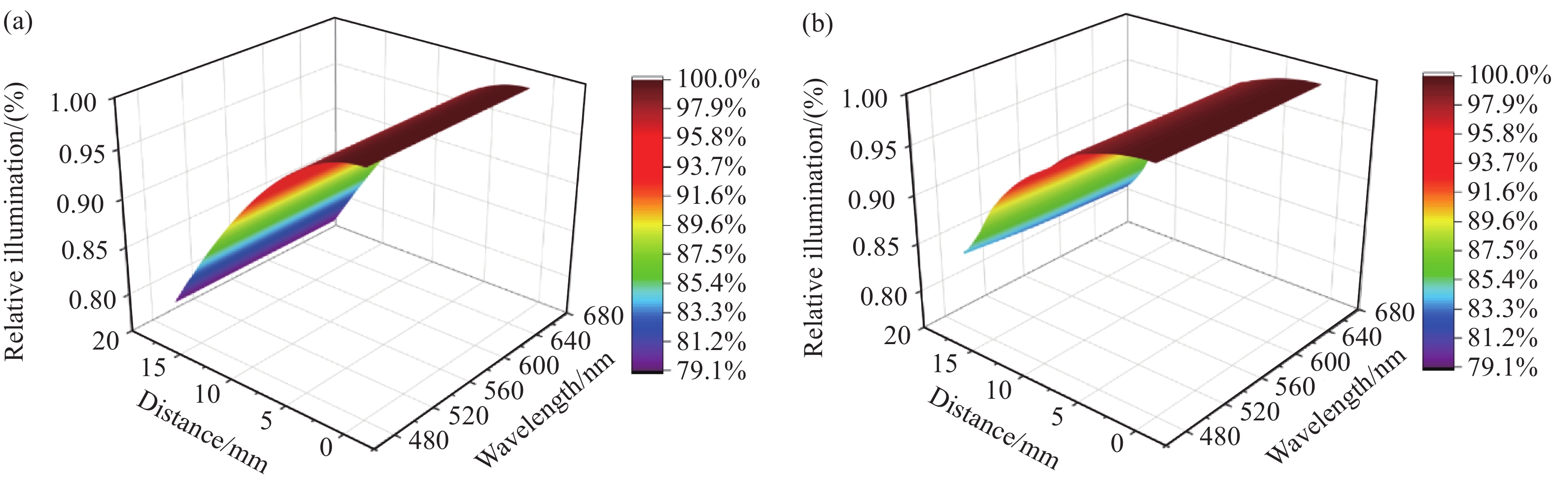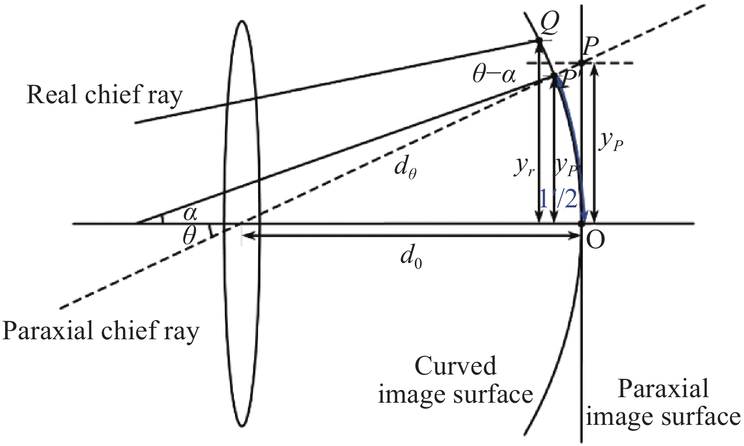 针对轻量化AR眼镜对搭载摄像头的大视场与高紧凑性的需求,本文提出了结合弯曲像面的设计方法。首先,由高斯光学理论对弯曲像面成像系统进行理论分析,推导各光学系统Petzval像面曲率特性,并通过双系统仿真对比,重点分析弯曲像面的性能优势。然后,采用分段多目标优化策略,设计了一款大视场紧凑性的光学系统。最后,对光学系统进行像质评价和公差分析。该光学系统由5片非球面塑料透镜和一片后置滤光片组成,系统焦距为3.1 mm,视场角可达80°,系统总长仅4.07 mm。设计结果表明:在223 lp/mm处,各视场的调制传递函数均优于0.32,全视场最大RMS光斑半径为2.41 μm,最大畸变为2.5%,相对照度均优于45%。研究成果可为曲面传感器的应用奠定基础,并为大视场紧凑型镜头的设计提供技术参考。