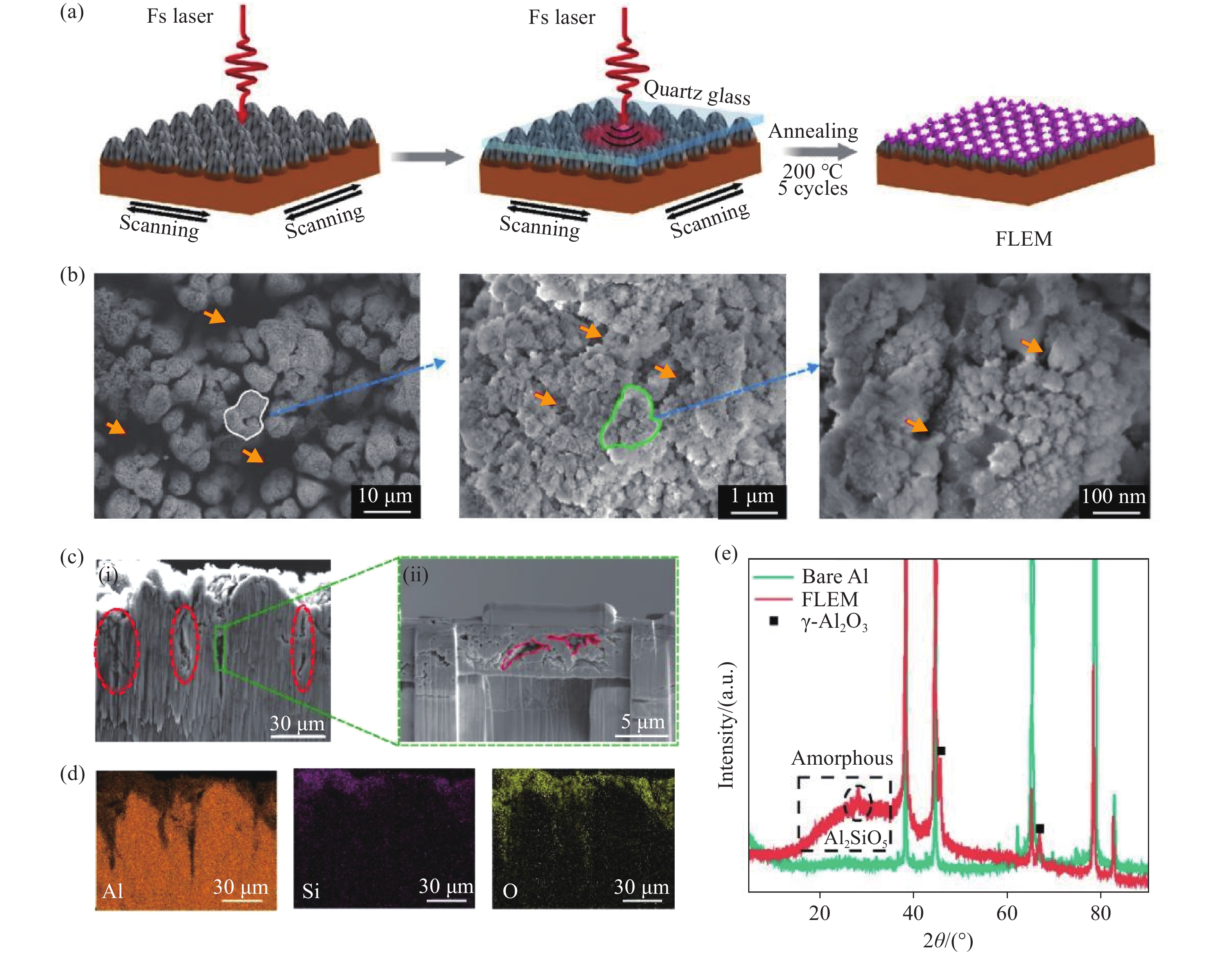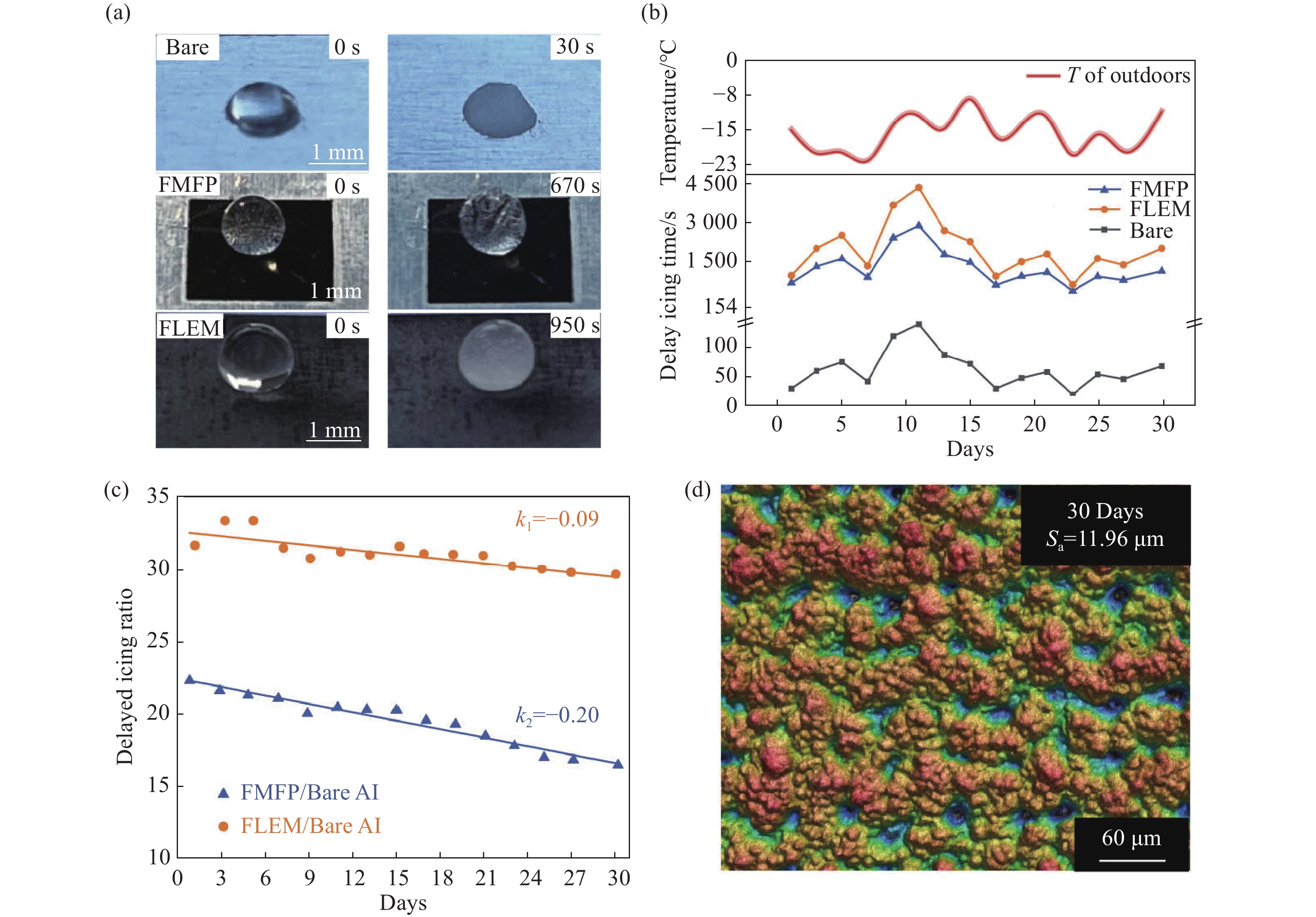 超疏水表面作为一种有效的被动防冰方法,可以减少低温环境下金属表面的结冰。然而,由于其通常采用的有机物修饰在恶劣环境下易老化,从而导致防冰性能下降或完全失效。本文采用飞秒激光掺杂制备微结构方法同时改变铝合金表面微观形貌和化学成分,实现材料表面无机超疏水防冰效果。与未加工铝合金和传统氟硅烷改性的铝合金表面相比较,激光掺杂加工后的铝合金表面具有较低的热导率和仿生蚁丘群结构,使得其具有良好的延迟结冰时间(803.3 s)和较低的冰附着力(16 μN)。此外,这种本征超疏水金属表面在防冰方面也表现出优异的环境耐久性。上述研究结果证实本文获得的无机超疏水样品在防结冰方面的有效性。