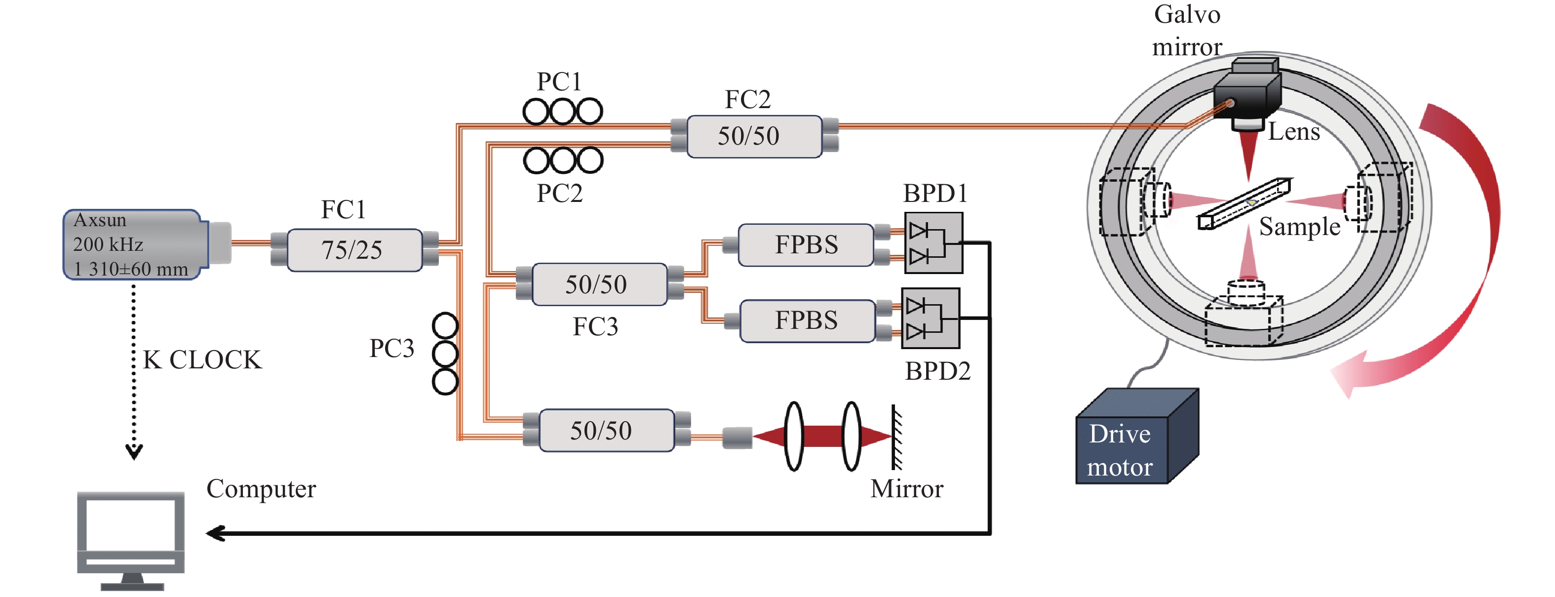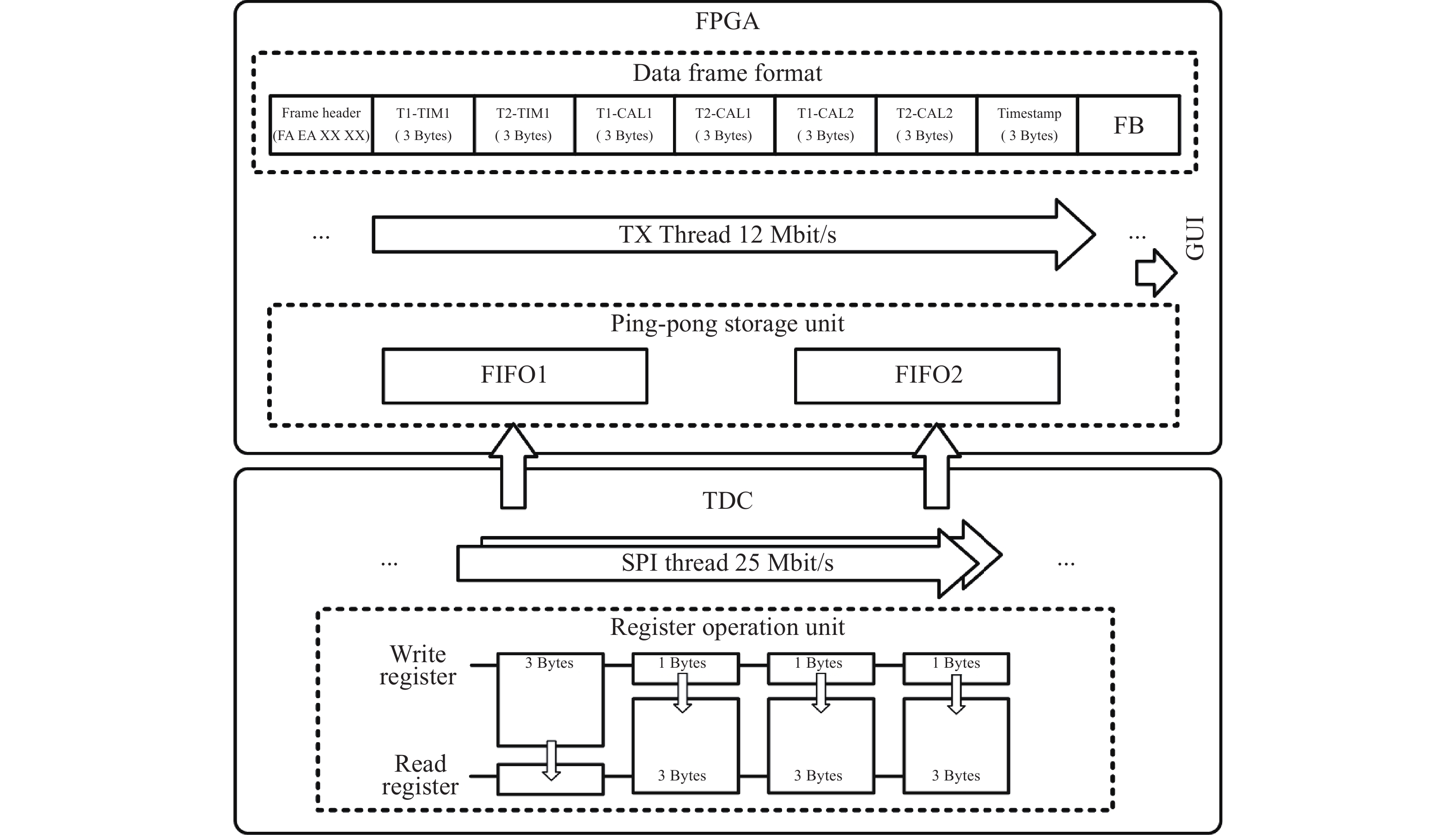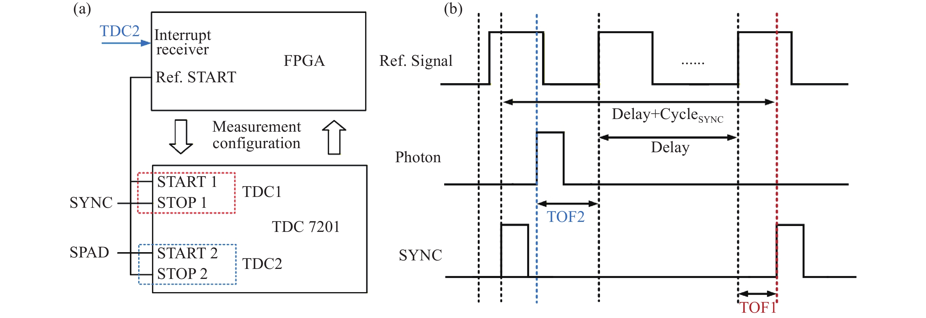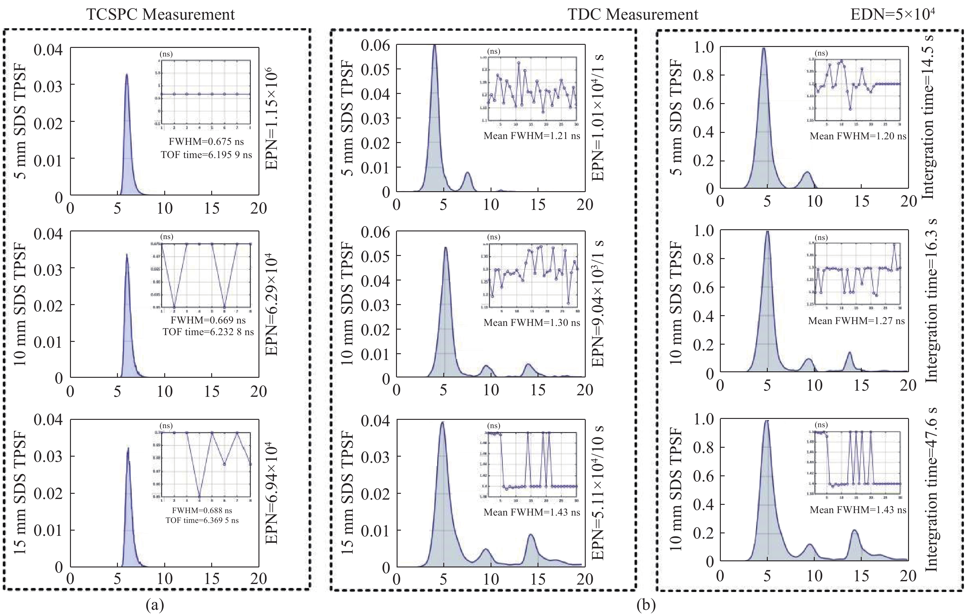 时域扩散光学成像(time domain diffuse optical imaging, TD-DOI)作为一种先进的组织光学成像技术,通过时间相关单光子计数(time-correlated single photon counting, TCSPC)系统可实现生物组织吸收系数与散射系数的定量重建,从而精确评估组织氧代谢、血流灌注等关键生理参数。然而,受限于TCSPC系统固有的硬件复杂性、高成本特性,目前难以实现临床场景下在体多通道动态监测的规模化应用。本文发展了一种双通道差分混合触发参考信号策略,通过结合差分时间数字转换(time-to-digital converter, TDC)器件和光子计数技术,构建稳定可靠的时间扩展曲线(time point spread function, TPSF)测量体系,实现了激光同步信号与出射光子信号时间延迟的亚纳秒级精确标定。实验验证数据显示,所发展系统时间分辨率为55 ps,在2.3×104 光子/s计数率下,TPSF波动系数可稳定控制在1.35%以内(积分时间1 s)。针对组织仿体的光学参数反演测试表明,组织光学参数反演精度方面,吸收系数与约化散射系数的平均反演误差分别在5.39%和4.34%以内。该技术方案显著提升了TD-DOI多通道并行检测可行性,特别适用于脑皮层血氧饱和度动态监测等生物医学场景,为开发新一代穿戴式光学脑功能成像设备奠定了技术基础。