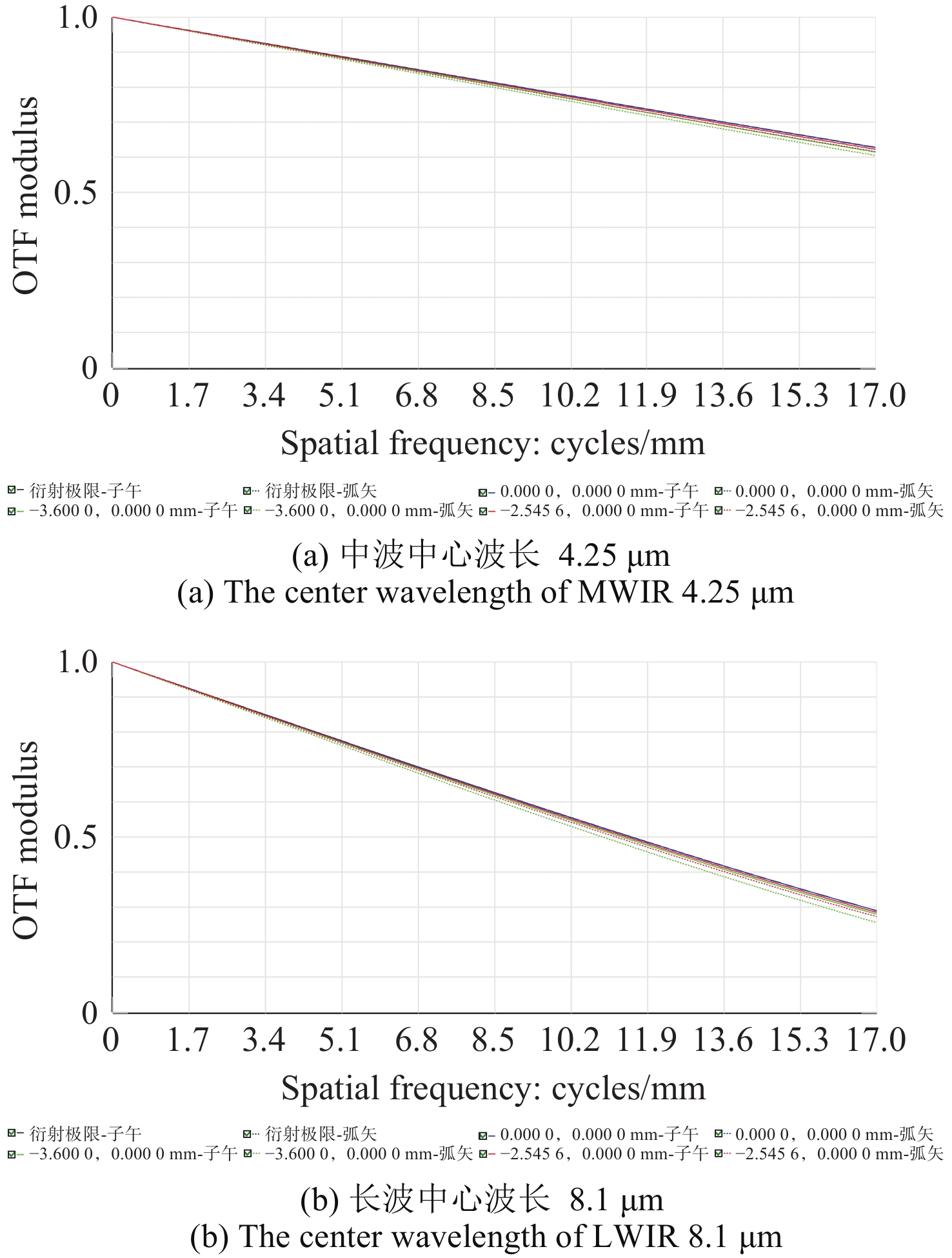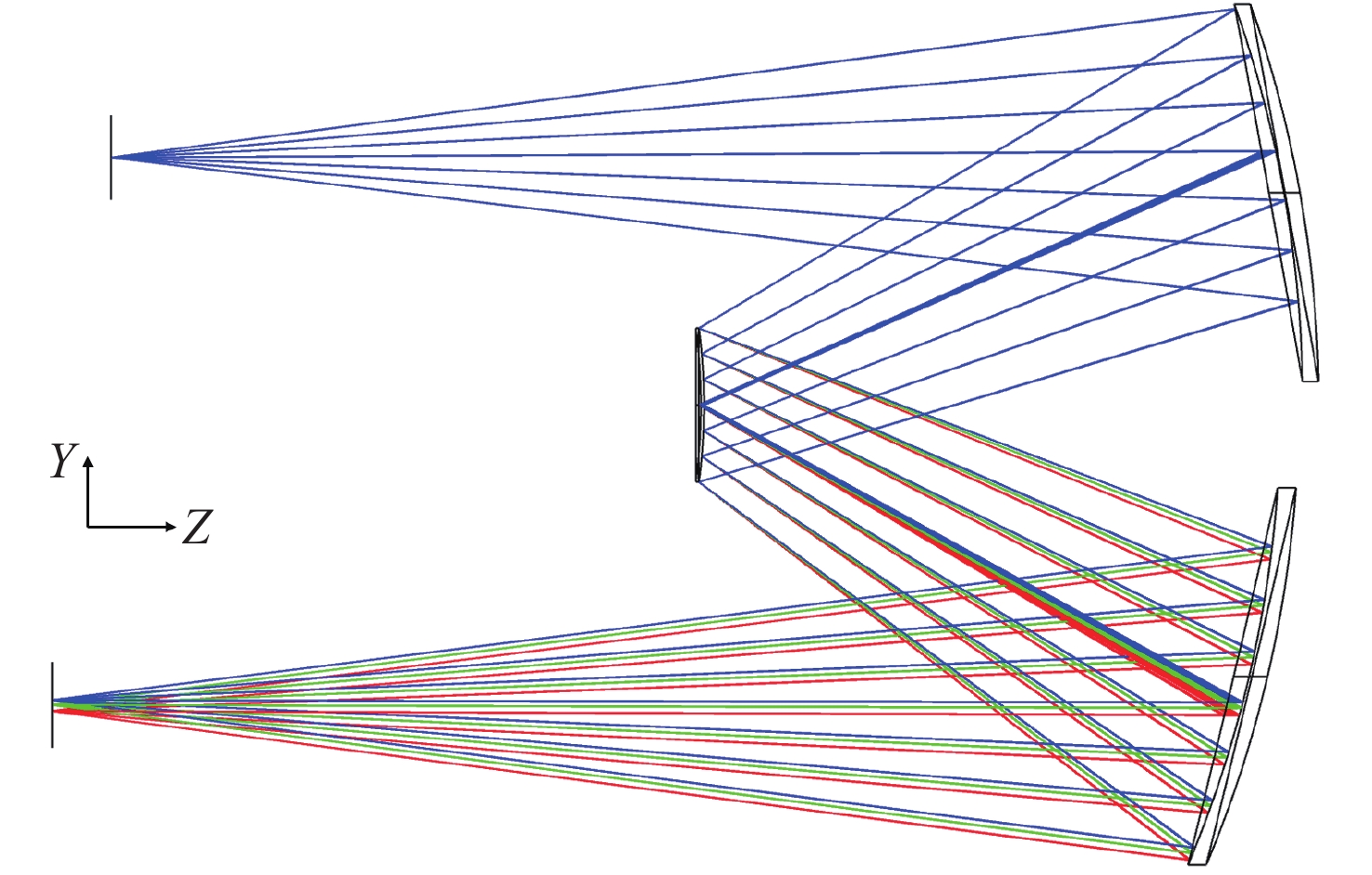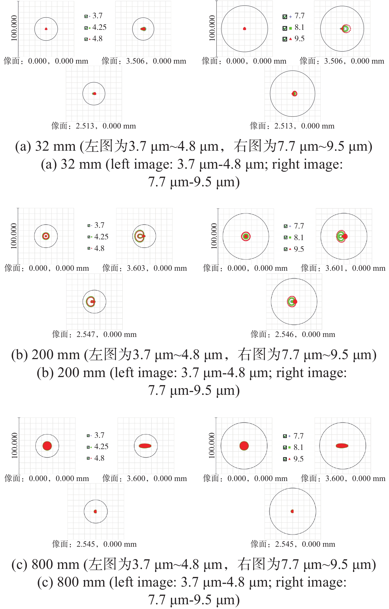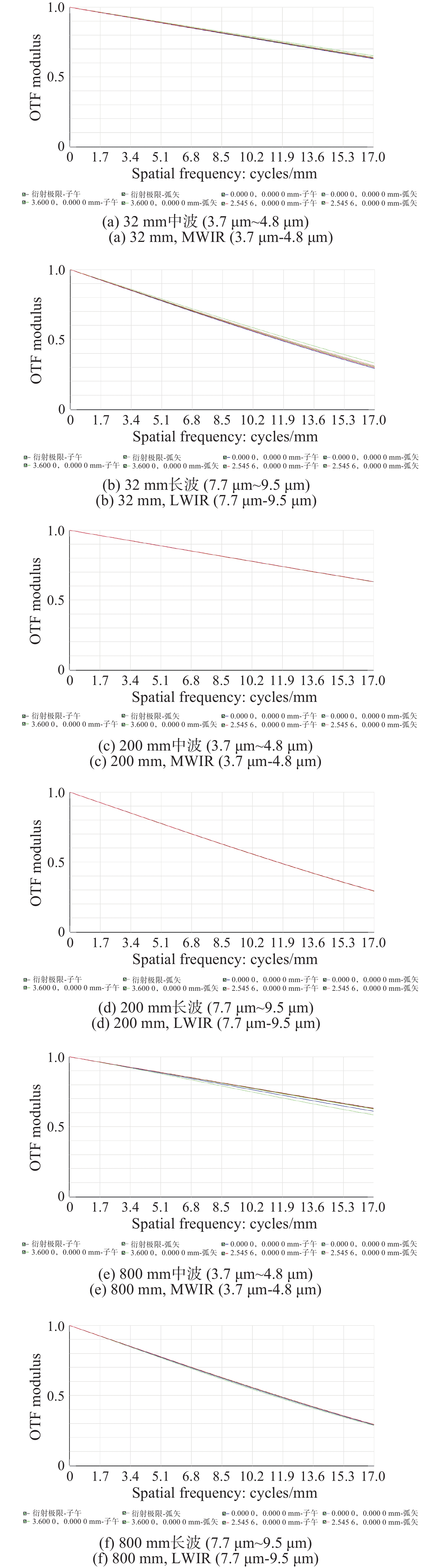 随着中长红外高光谱成像技术的突破性进展,军用高光谱成像系统凭借其独特的特征识别能力和隐蔽侦察优势,在现代战场态势感知领域展现出了显著的战略价值。本研究面向航空探测应用需求,基于320×240像素双色制冷型红外探测器,设计了一种工作于中波红外(3.7~4.8 μm)和长波红外(7.7~9.5 μm)的双波段Offner型光谱成像系统。该系统采用折射与折反射混合光学结构,实现了32 mm、200 mm、800 mm三视场切换式变焦功能。光学系统采用Offner分光结构,有效抑制了系统初级像差;其次,通过引入二次成像中继系统,实现了100%冷光阑匹配,有效降低了冷反射效应。实验测试结果表明,该系统在各波段及不同焦距状态下均表现出优异的成像性能,在特征频率17 lp/mm处,调制传递函数接近衍射极限,且温度变化对成像质量变化影响不大,光学像质满足指标设计。该光学系统兼具宽光谱响应、大变倍比(25×)和快速视场切换等特点。光谱分辨率达到25 nm,其成像质量与光谱分辨能力满足航空光电侦察的技术需求,在军事侦察、安防监控及环境监测等领域具有重要的应用价值。