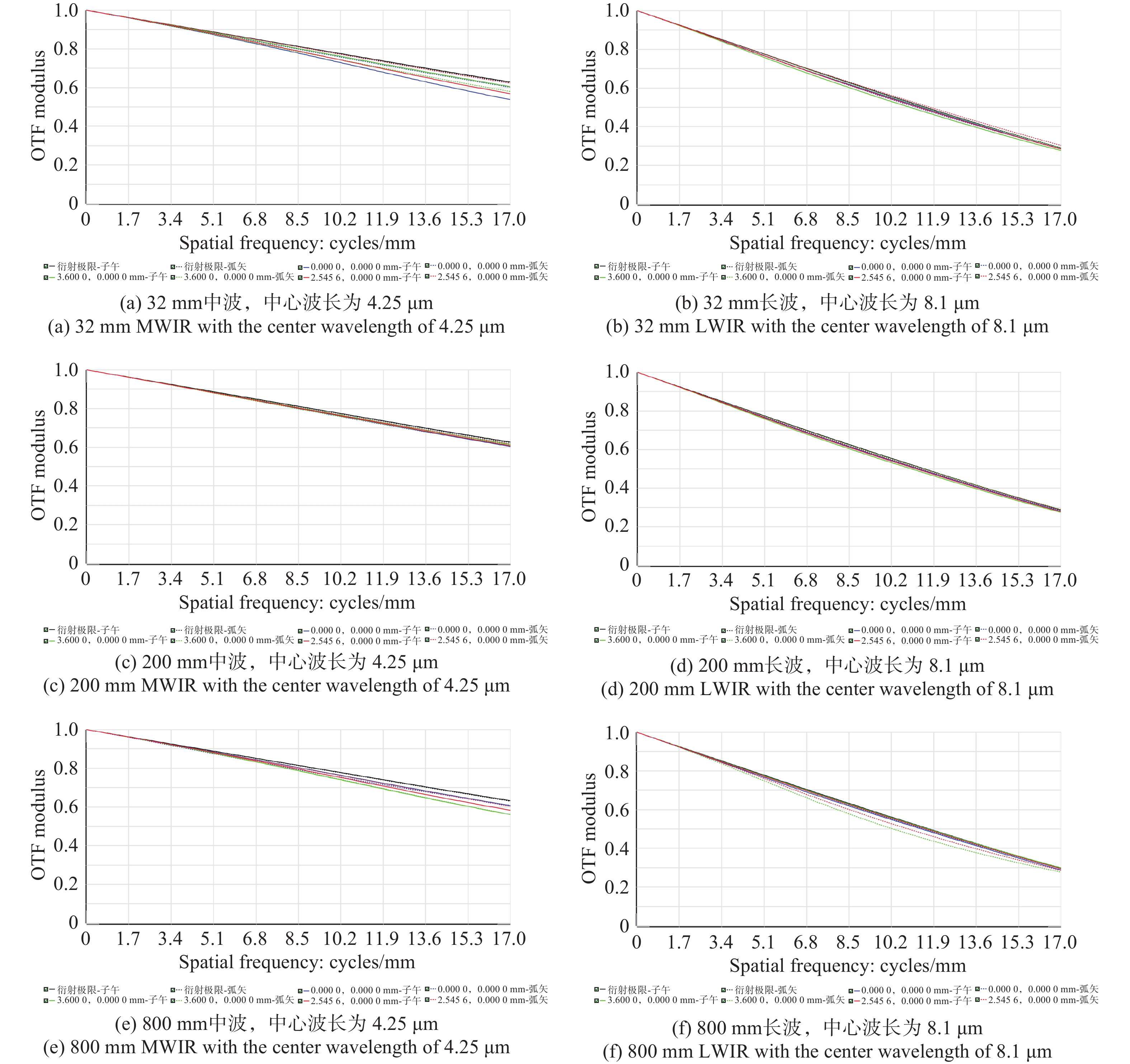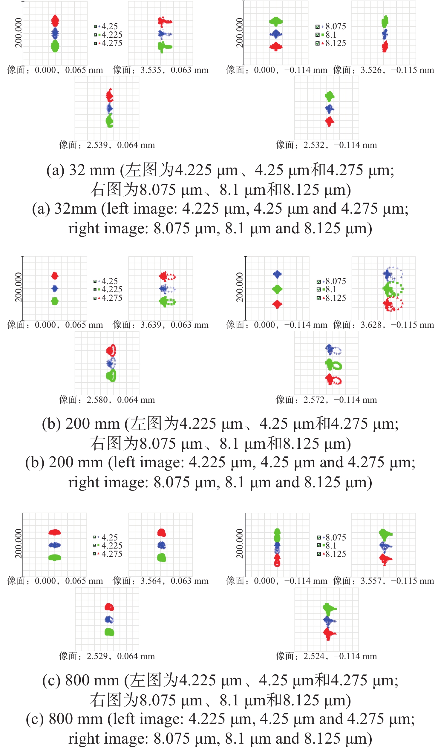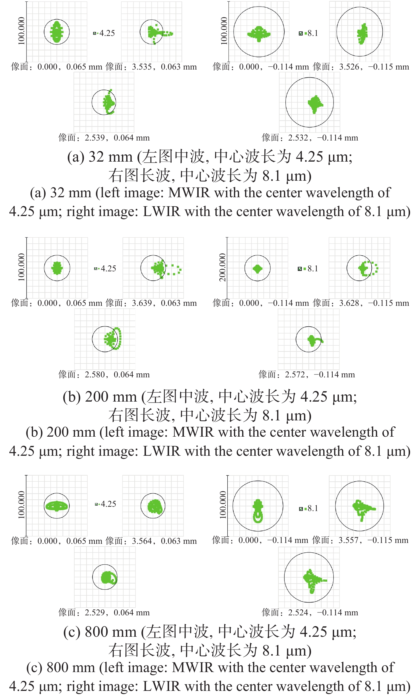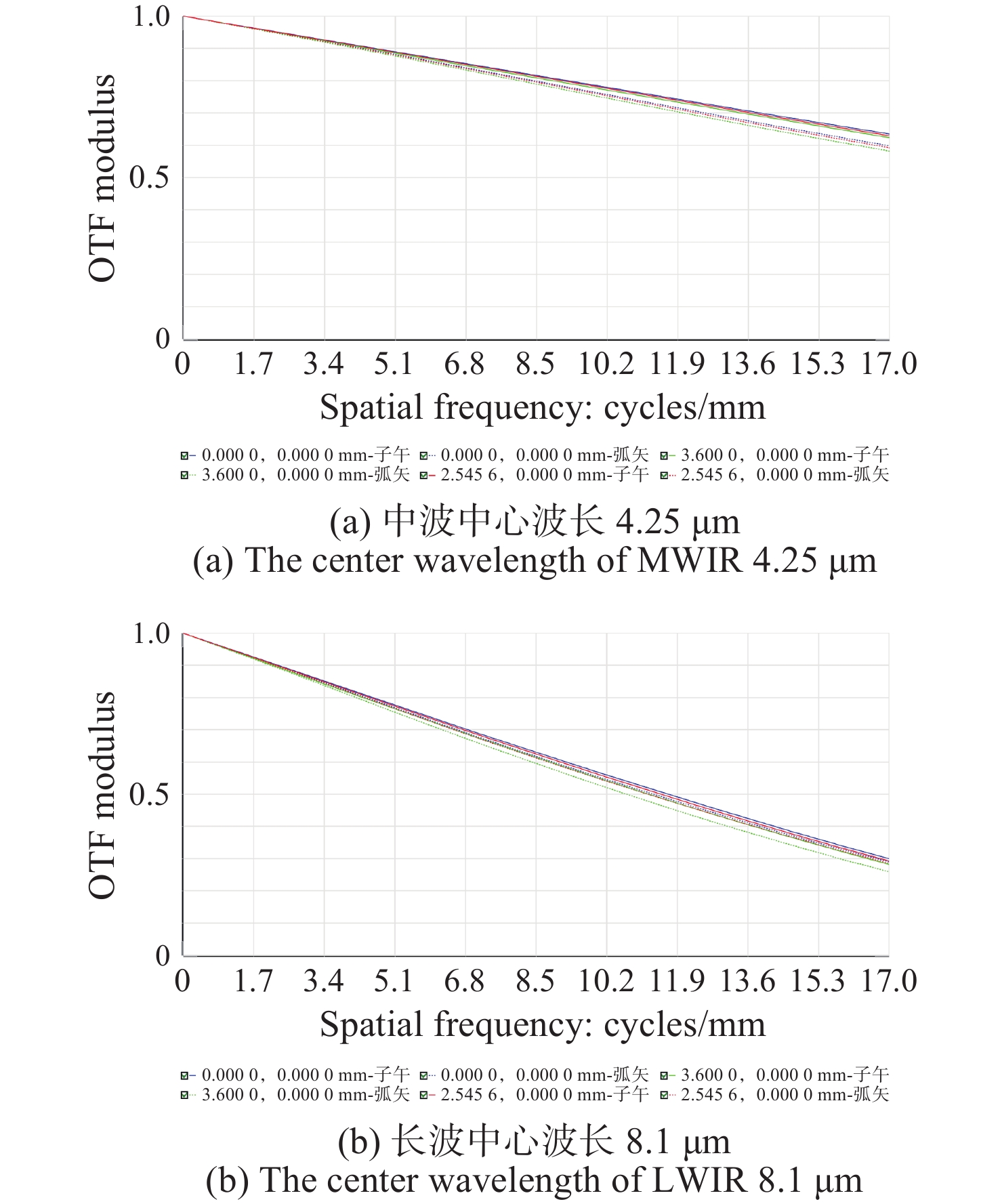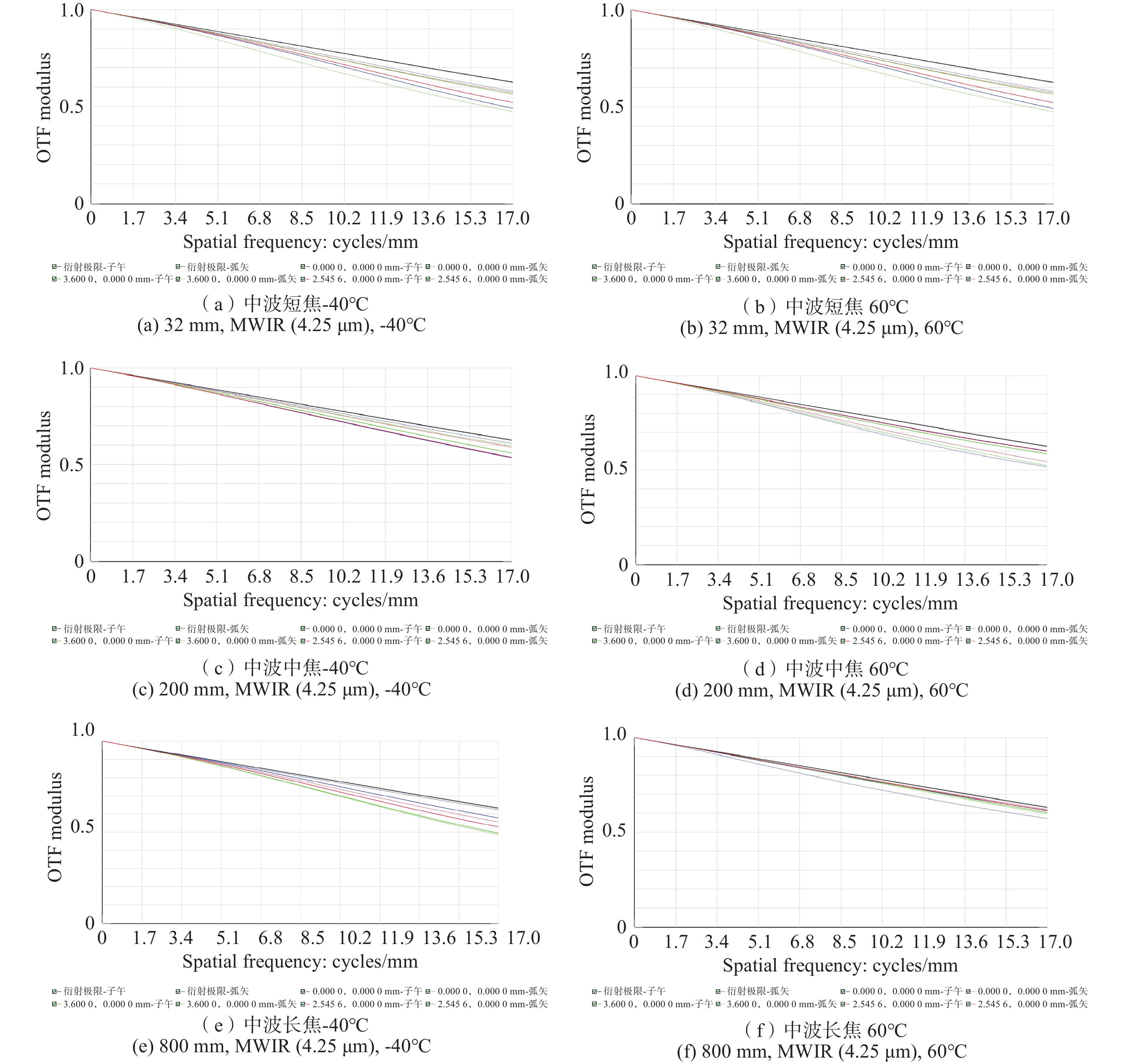 随着中长红外高光谱成像技术的突破性进展,军用高光谱成像系统凭借其独特的特征识别能力和隐蔽侦察优势,在现代战场态势感知领域展现出了显著的战略价值。本研究面向航空探测应用需求,基于320×240像素双色制冷型红外探测器,设计了一种工作于中波红外(3.7~4.8 μm)和长波红外(7.7~9.5 μm)的双波段Offner型光谱成像系统。该系统采用折射与折反射混合光学结构,实现了32 mm、200 mm、800 mm三视场切换式变焦功能。光学系统采用Offner分光结构,有效抑制了系统初级像差;其次,通过引入二次成像中继系统,实现了100%冷光阑匹配,有效降低了冷反射效应。实验测试结果表明,该系统在各波段及不同焦距状态下均表现出优异的成像性能,在特征频率17 lp/mm处,调制传递函数接近衍射极限,且温度变化对成像质量变化影响不大,光学像质满足指标设计。该光学系统兼具宽光谱响应、大变倍比(25×)和快速视场切换等特点。光谱分辨率达到25 nm,其成像质量与光谱分辨能力满足航空光电侦察的技术需求,在军事侦察、安防监控及环境监测等领域具有重要的应用价值。