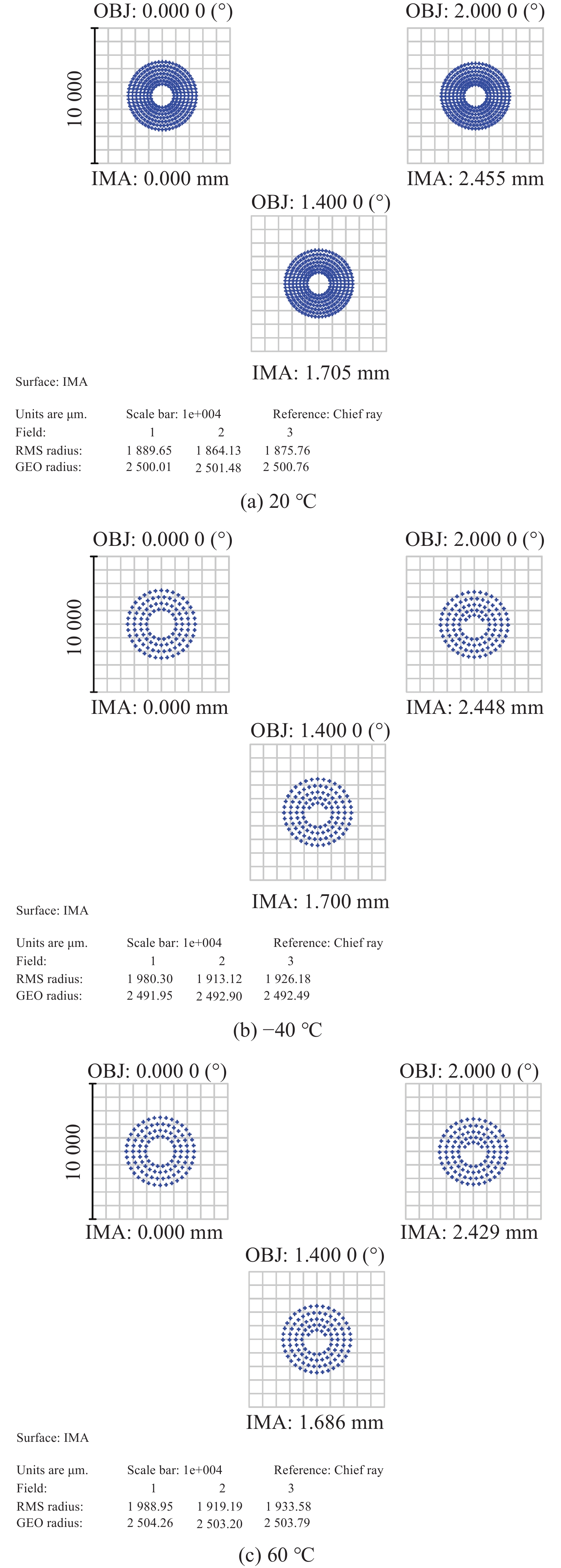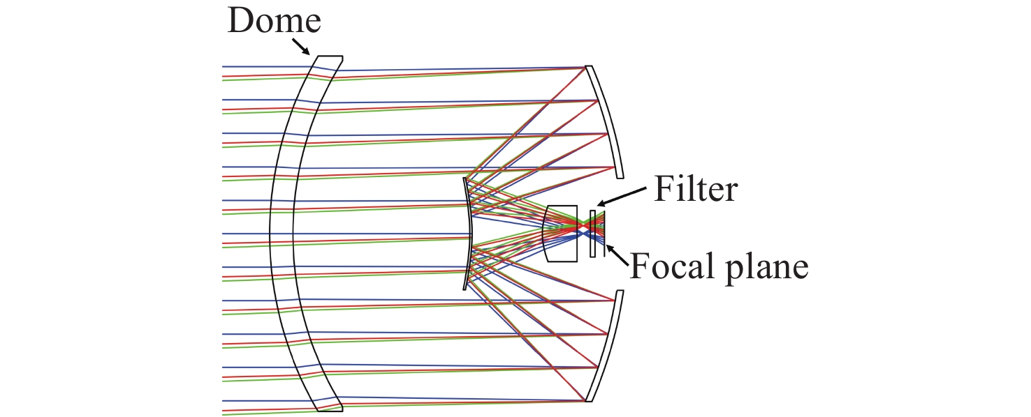为降低激光制导导引头的失调角误差,需要在光学设计方面优化能量信号质量。本文基于像差理论结合光学设计软件的计算功能获得设计起点,分别从光学结构形式和像差平衡优化角度入手对光学系统进行逐步迭代设计。通过控制像方远心,增强光斑的对称性以提高测角精度;通过对光学塑料材料的性能分析,论证了采用光学塑料制造导引头光学结构的可行性。最终完成焦距为71.6 mm,F/#为1的光学系统设计,边缘视场主光线远心度小于6 mrad。在工作温度范围内,光斑尺寸的稳定性优于0.4%;全视场最大畸变小于0.5%,在±2°视场范围内的光斑线性度与能量响应一致性均能满足精确制导要求。基于最小初阶像差的结构设计思路可以用于折反系统的优化,该方法可为同类导引头光学结构设计提供借鉴。