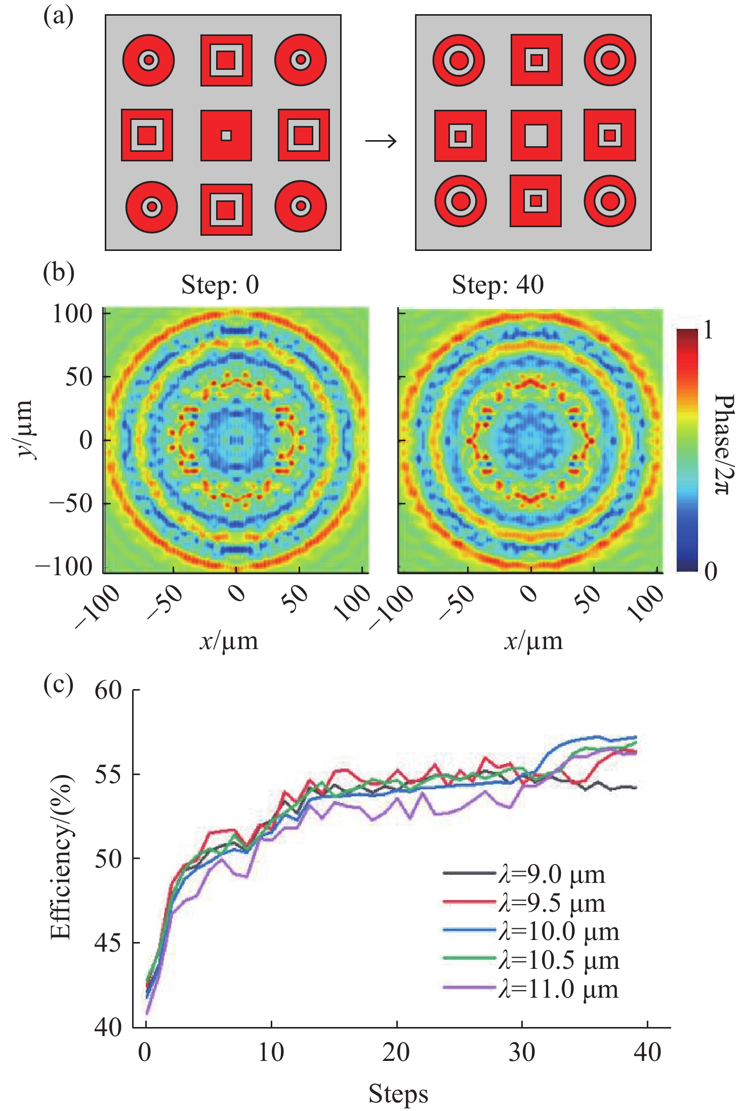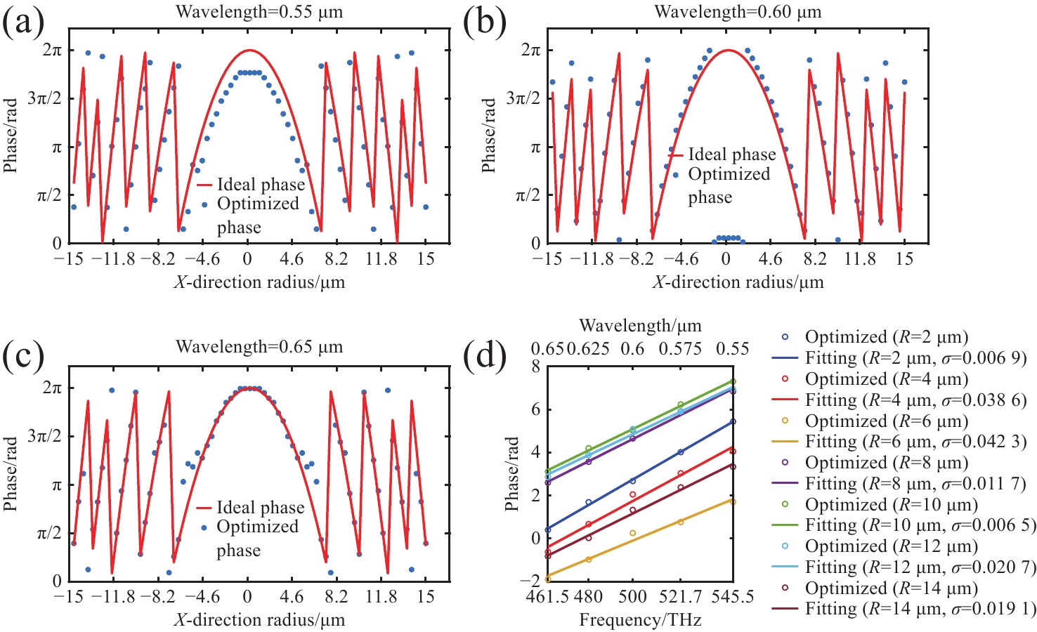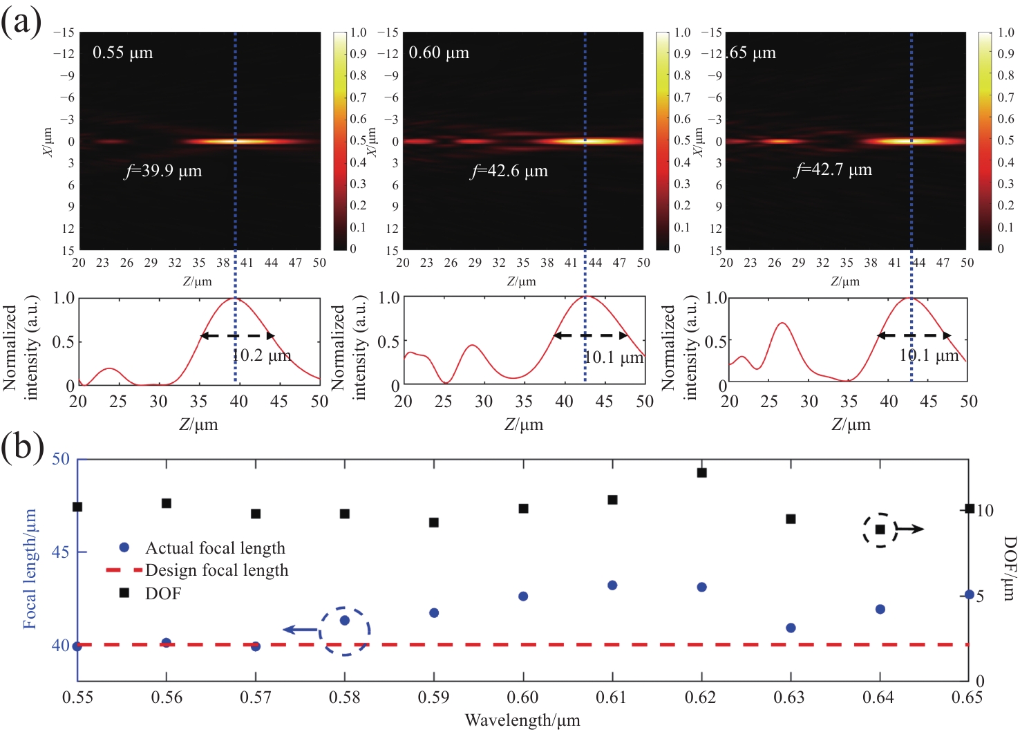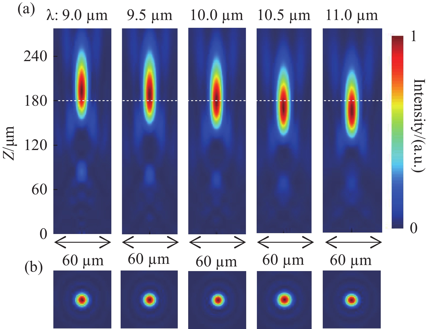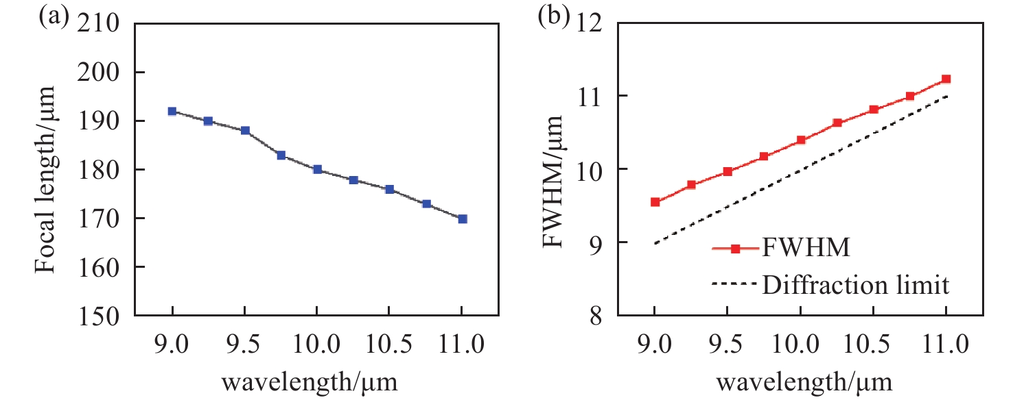 超透镜技术在小型化、集成化红外成像系统中有着广泛的应用。然而,由于单元结构的色散较高,导致超透镜经常出现色差,使得宽带消色差红外成像难以实现。该文章构建了基于硫系玻璃的6种不同单元结构,并对其相位色散参数进行分析,建立数据库。在此基础上,采用色差补偿和参数化伴随拓扑优化的方法,在远红外波段将这6种单元结构排列组合,设计出数值孔径为0.5的宽带消色差超透镜。仿真结果表明,该超透镜在9~11µm的工作波长范围内实现了近衍射极限聚焦,具有良好的消色差性能,全波长具有为54%~58%的平坦的聚焦效率。