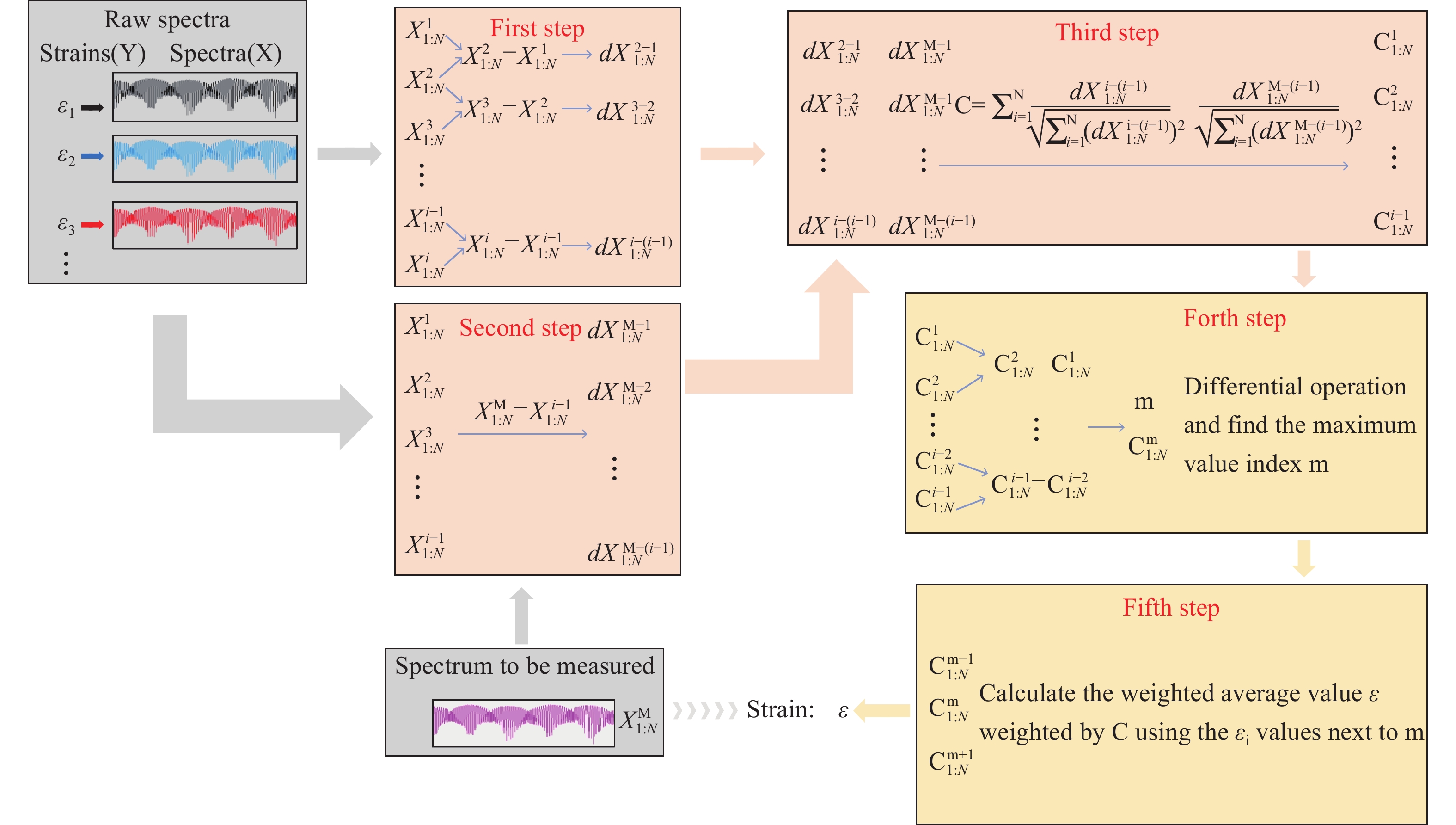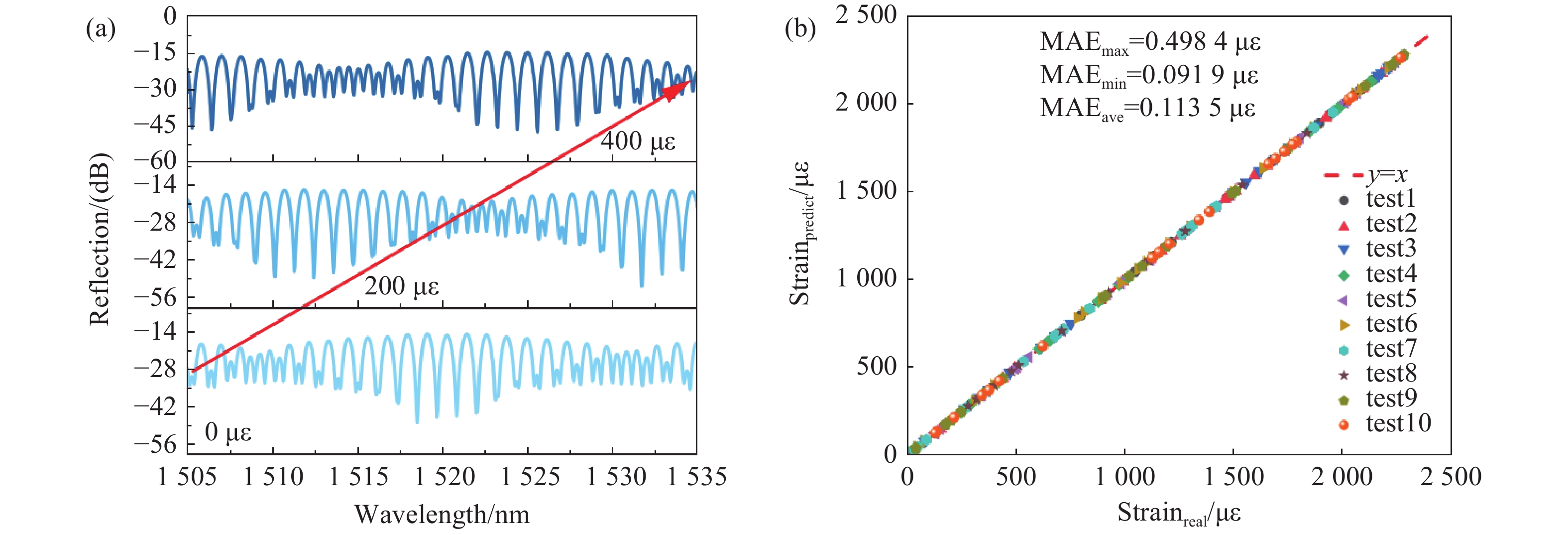 为了解决基于光学游标效应的光纤应变传感器中传统光谱跟踪解调方式测量精度不足、测量范围小的问题,本文提出了一种改进型互相关算法并将其应用于游标型光纤应变传感器信号解调。该算法通过互相关操作从采集的光谱数据中识别出与待测光谱最为相似的光谱,然后通过加权计算得到预测应变值。由于该算法使用了被测量光谱中包含的全部信息,因此可以得到更准确的结果和更大的测量范围。经过实验验证,获得了