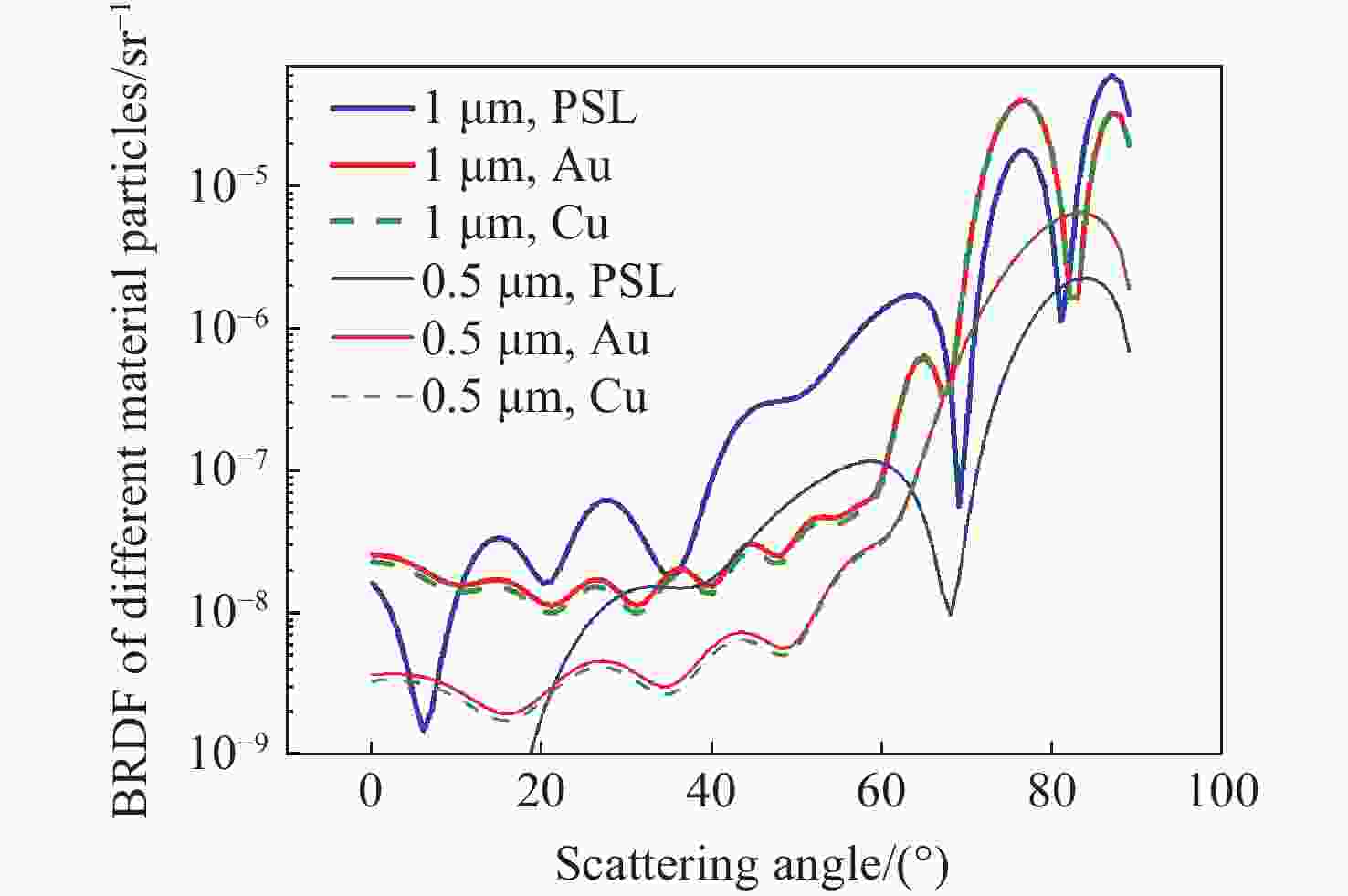 图 5 在正入射及斜入射时,微缺陷各散射角的能量分布。蓝色绿色实线和红色虚线分别为75°斜入射和正入射时反射面内不同散射角下半径分别为3 μm、1 μm、0.5 μm、0.1 μm PSL颗粒BRDF