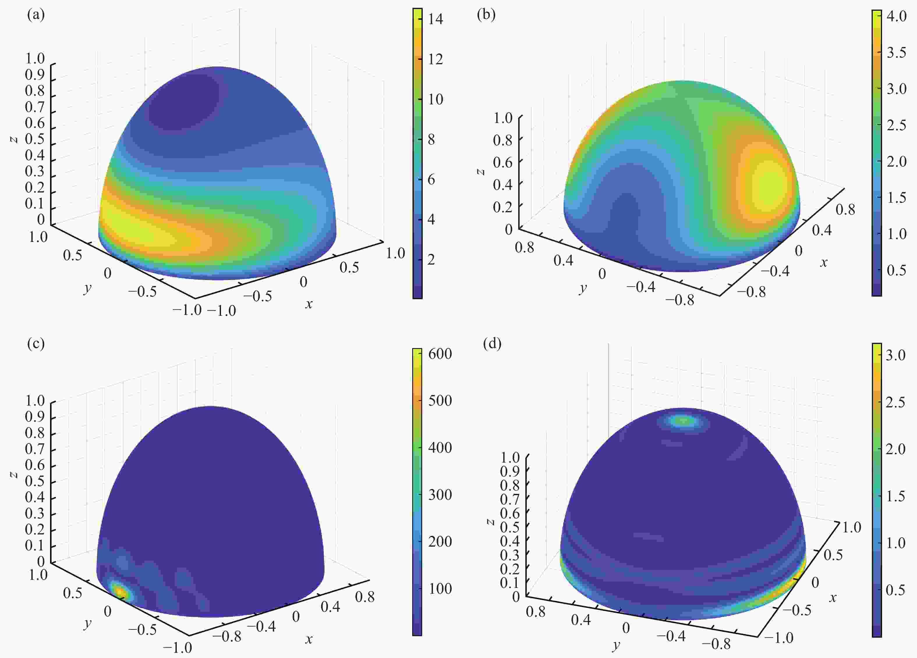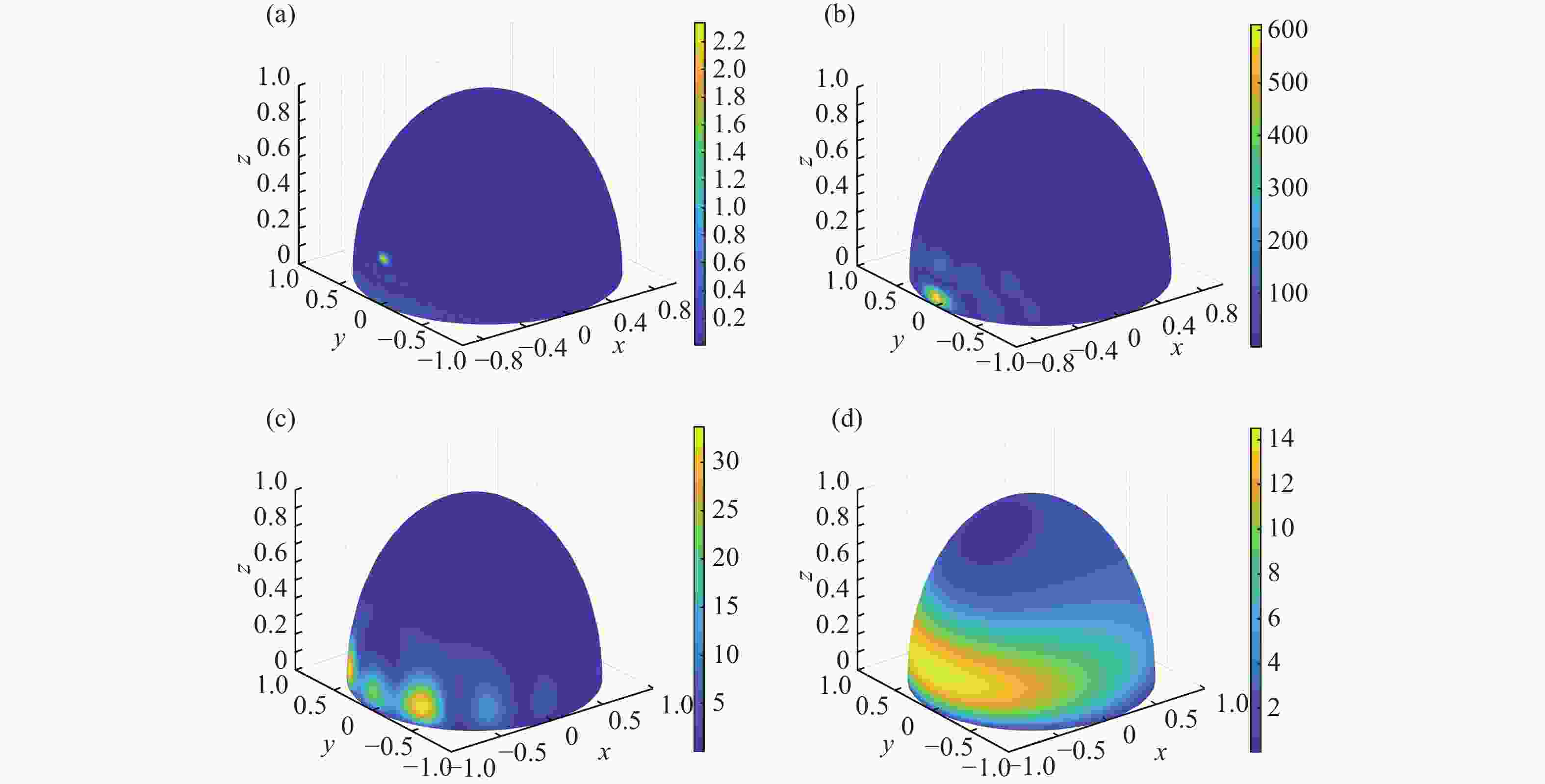 图 4 不同入射角度下的散射场空间分布。(a)和(b)为0.1 μm PSL颗粒在75°斜入射和正入射下的空间分布,(c)和(d)为1 μm PSL颗粒在75°斜入射和正入射下的空间分布