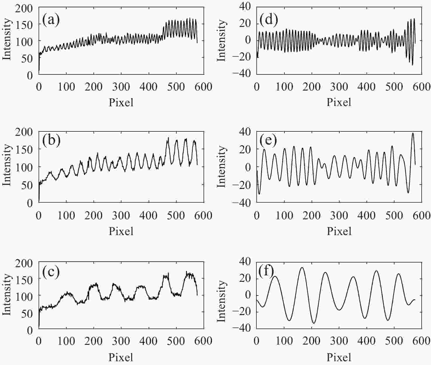 图 12 第256列变形条纹图初始RGB通道信号及fpFIF2分离的高、中、低载频项信号。(a)~(c)为第256列初始条纹图低、中、高频通道信号分布;(d)~ (f)为fpFIF2分离后的第256列低、中、高频通道信号分布