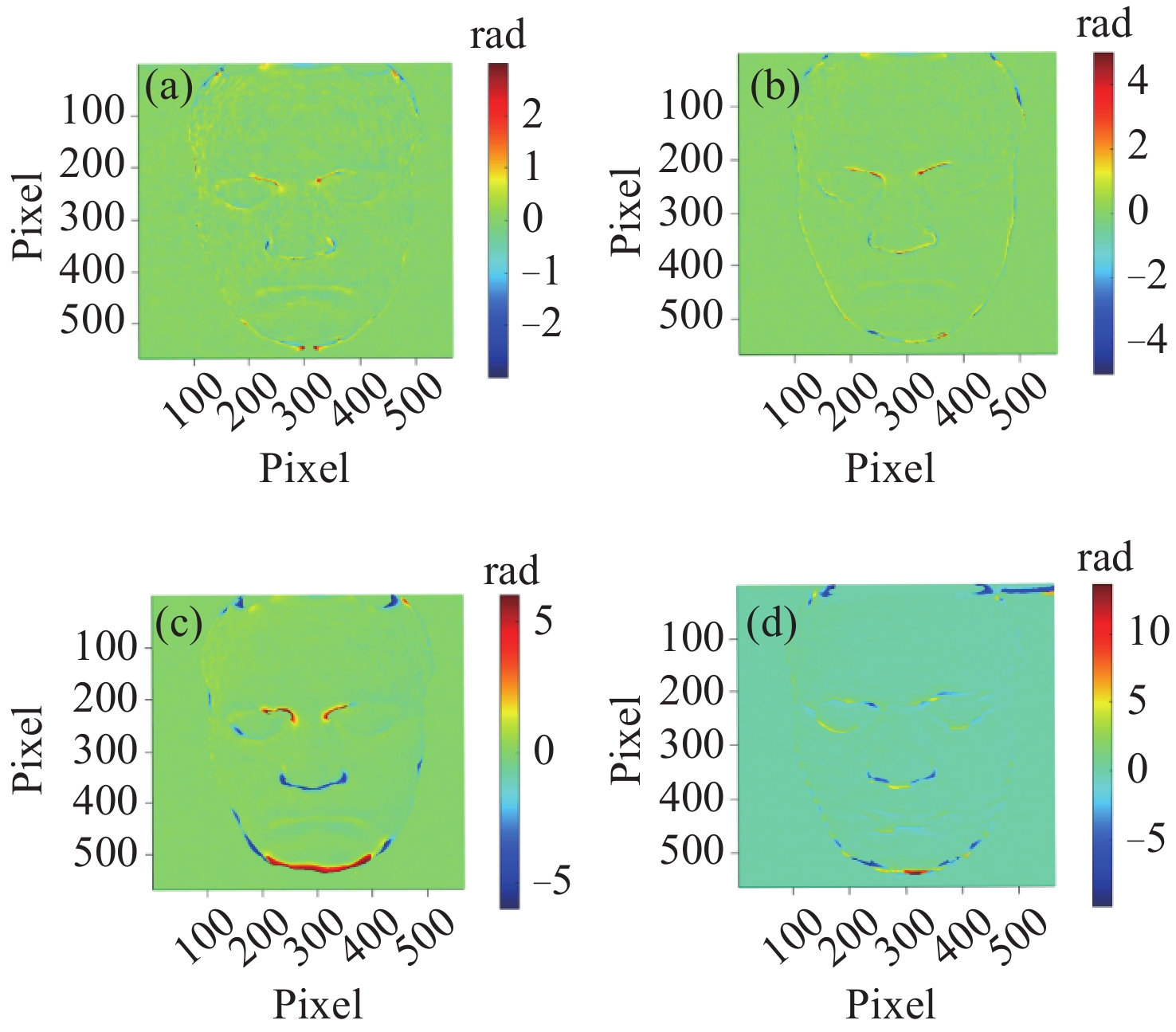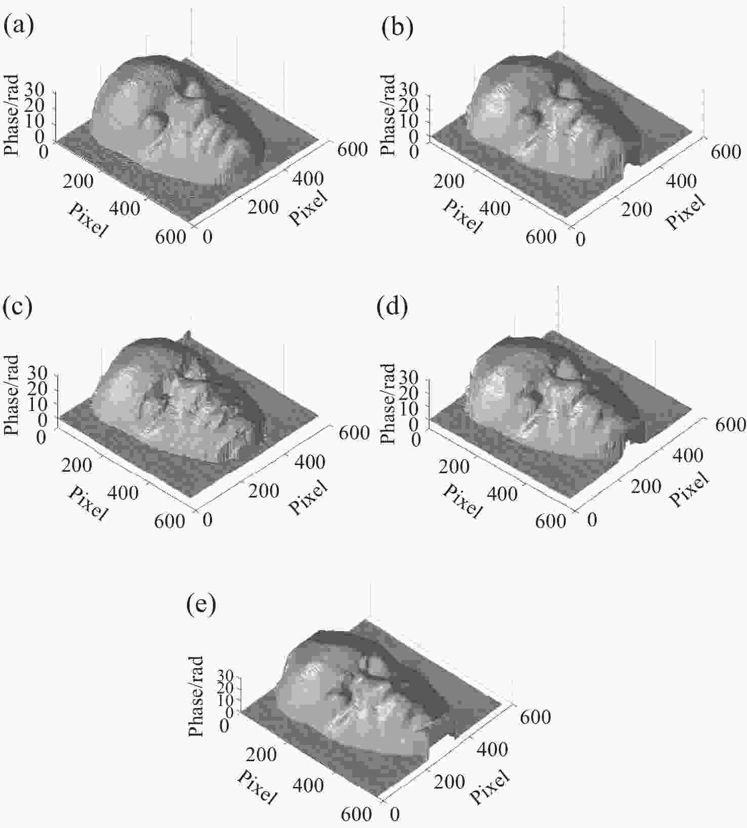 图 14 不同方法所求出的展开相位。(a) 四步相移法;(b) 本文方法;(c) FTP方法;(d) 基于VID的彩色条纹投影方法及 (e) 基于BEMD的彩色条纹投影方法