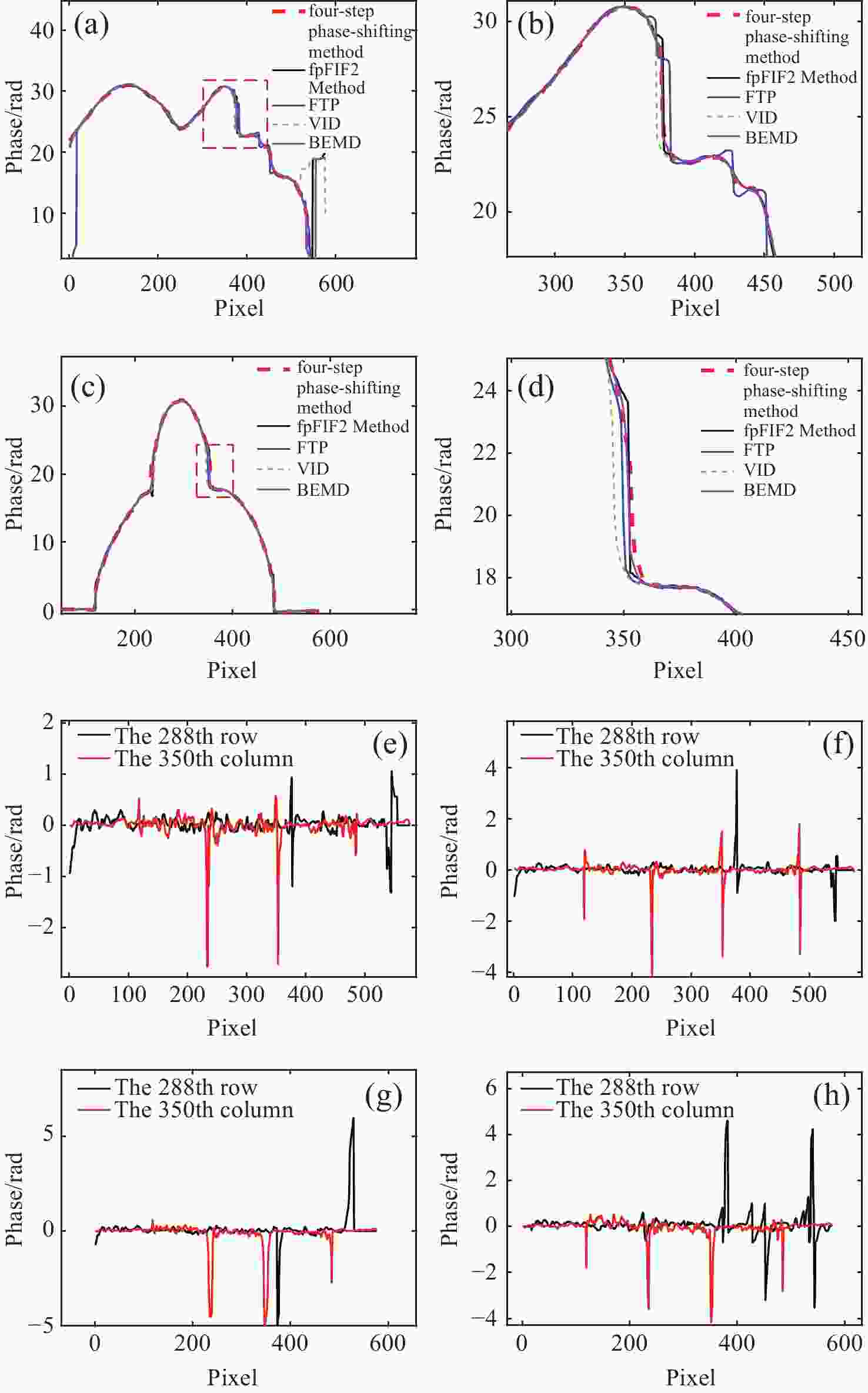 图 16 本文方法、基于VID方法、基于BEMD方法、FTP、四步相移法第288行和第350列展开相位数据及局部放大数据图。(a)上述几种方法第288行展开相位数据,其中黑色实线为本文方法;(b) 图(a) 鼻子处局部放大图;(c) 上述几种方法第350列展开相位数据;(d) 图(c)鼻子处局部放大图;(e) 本文方法、 (f) 基于VID的方法、 (g) 基于BEMD法及 (h) FTP方法与四步相移法第288行和第350列绝对误差